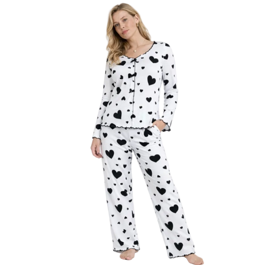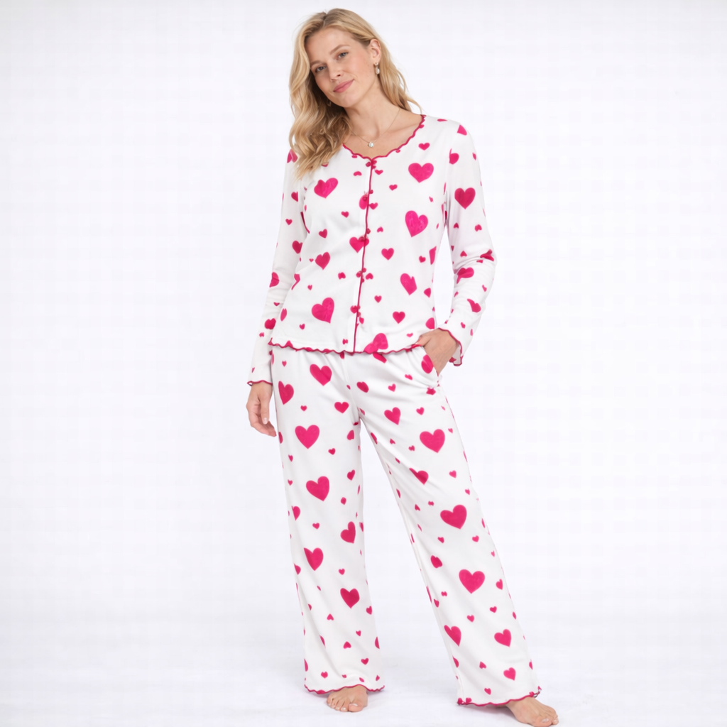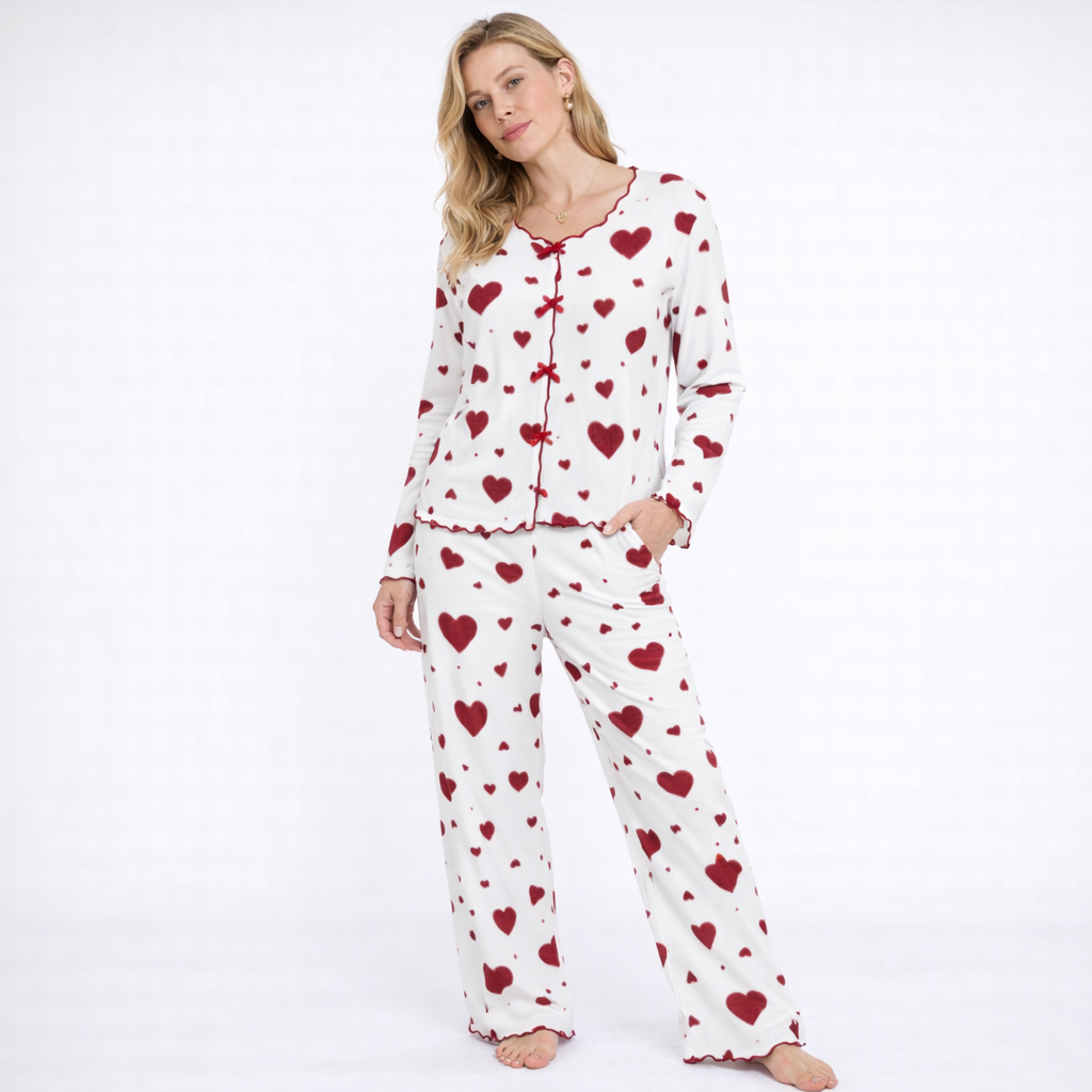 Dame Pysjsett med Hjertemønster – Langermet Topp og Bukse | Mykt og Varmt To-delt Nattøy til Høst og Vinter