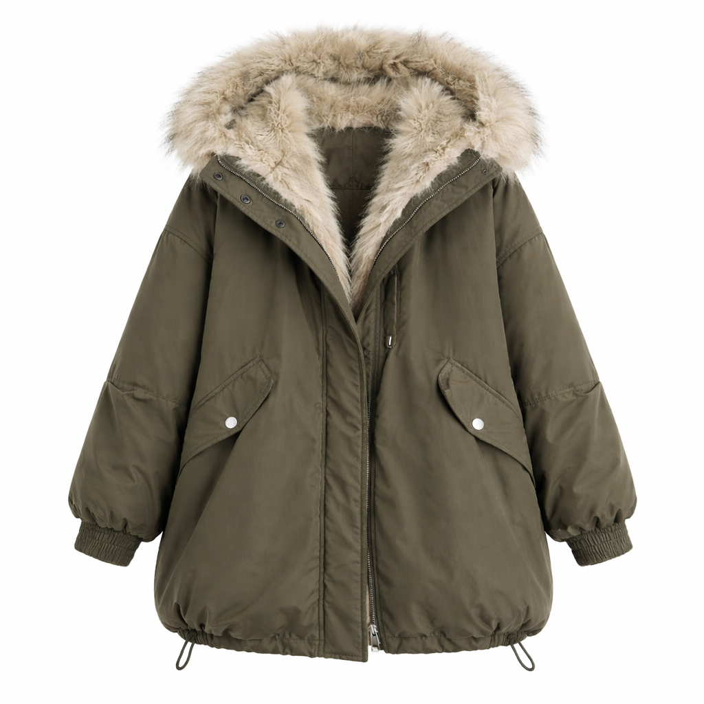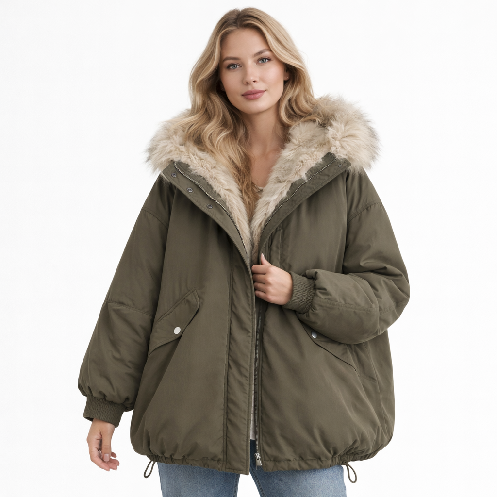 Dunjakke for Dame med Fuskepels – 90% Hvit Andedun | Løs, Varm & Elegant Jakke til Høst og Vinter