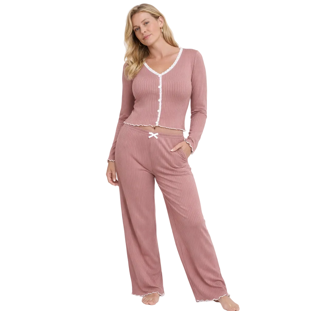 Elegant Dame Pysjsett med Blonder – Langermet Topp og Bukse | Mykt og Forførende Loungewear til Høst og Vinter (2024)