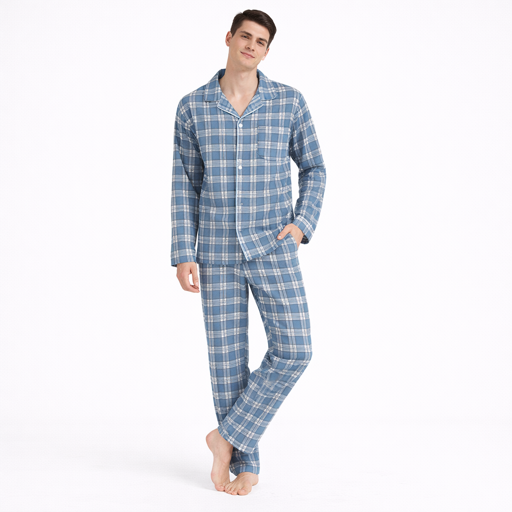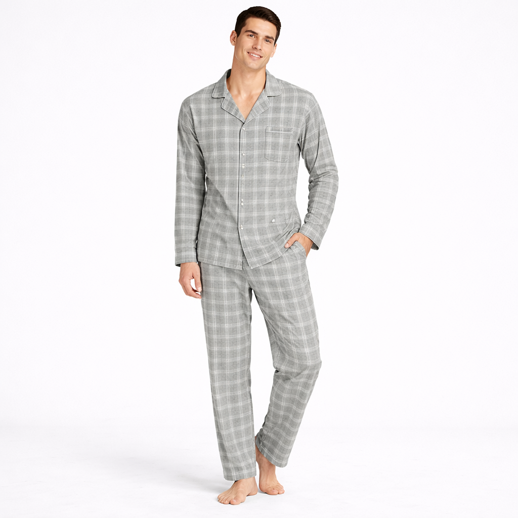 Herre Pysjsett i Dobbel Gassbomull – Langermet Skjorte og Bukse | Mykt og Pustende Nattøy til Vår og Høst