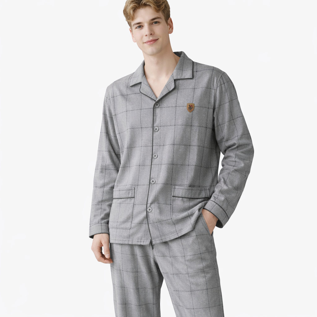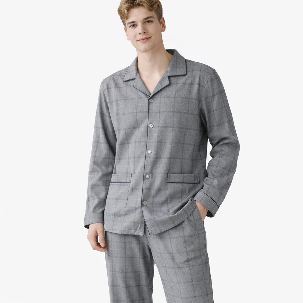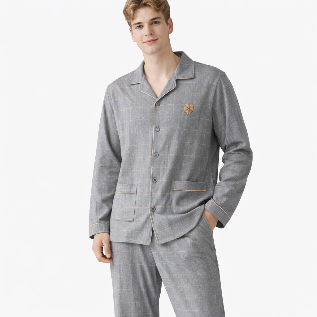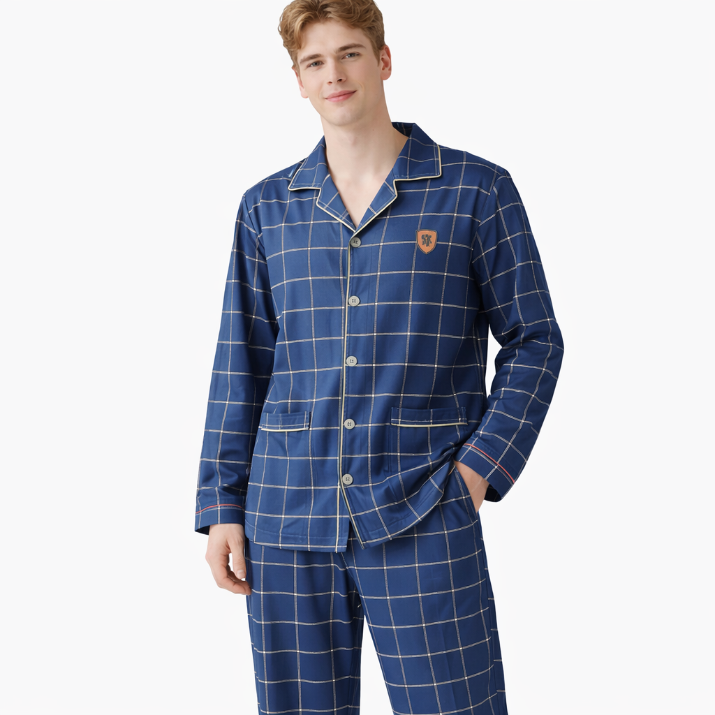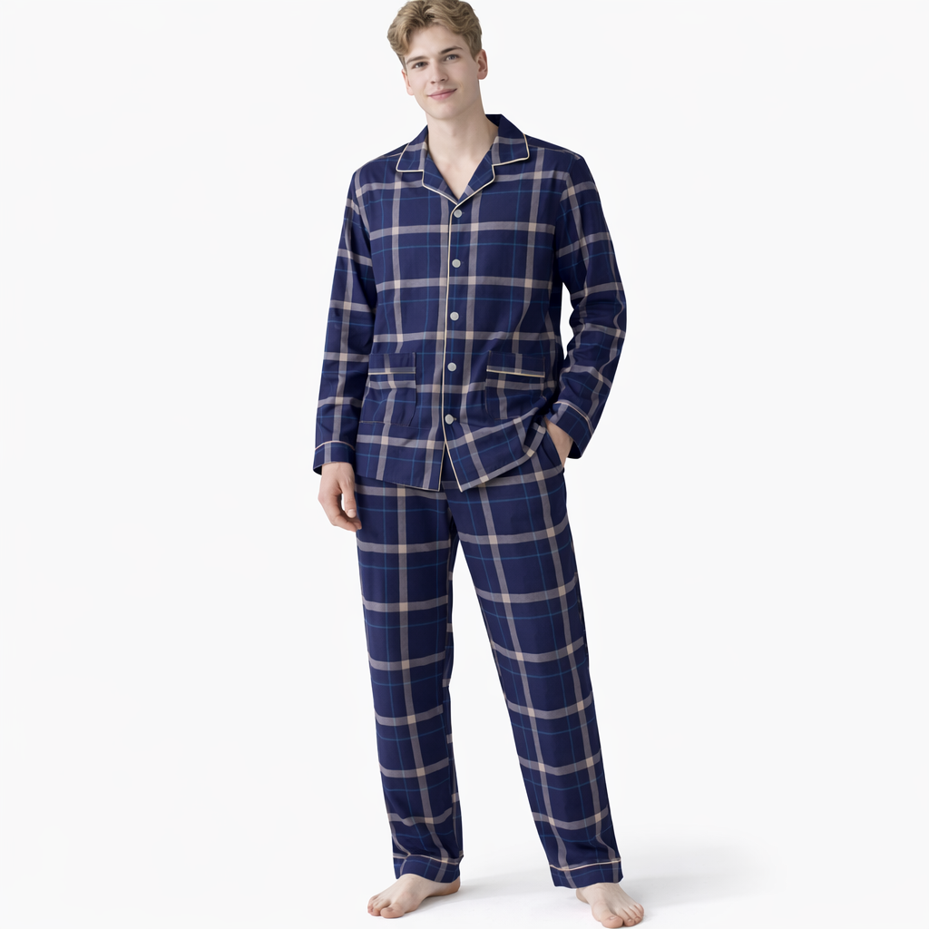 Herrepysjamas i Bomull – Rutete/Stripete 2-delt Sett med Krage (Turn-down Collar), Langermet | Høst/Vinter (3XL)