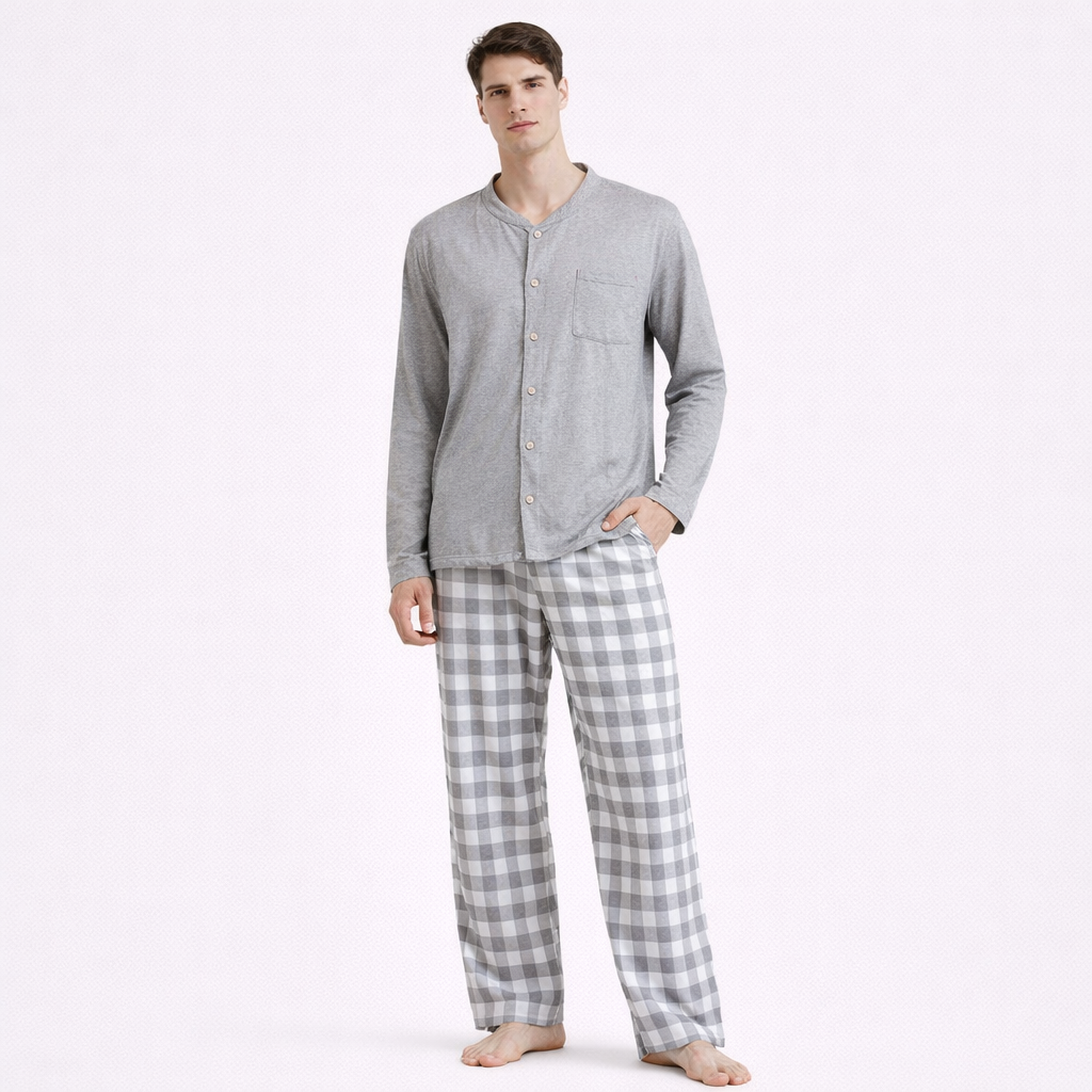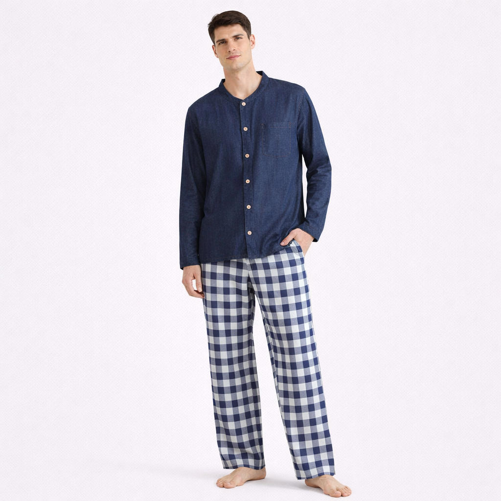 Japansk Pysjsett for Menn – 100 % Bomull i Rutete Design | To-delt Cardigan-sett med Langermet Skjorte og Bukse til Vår og Høst (2026)