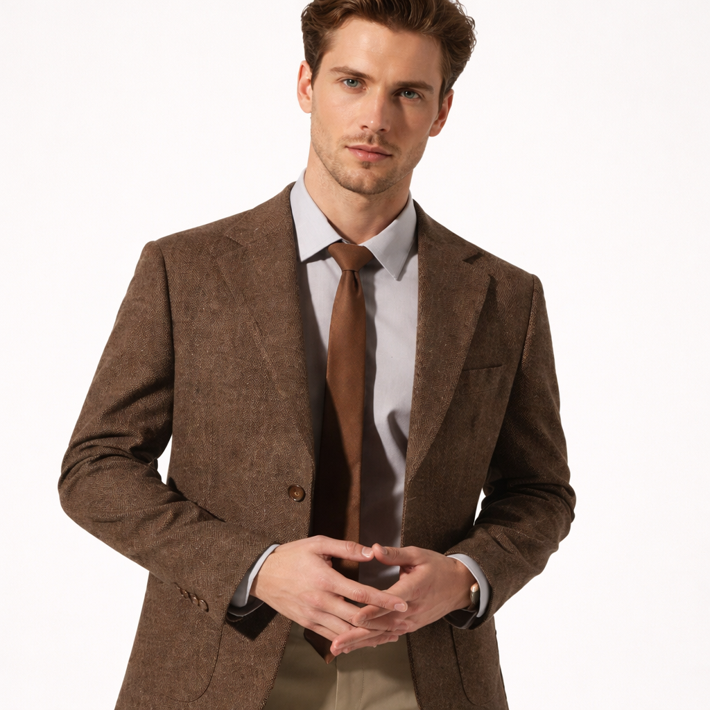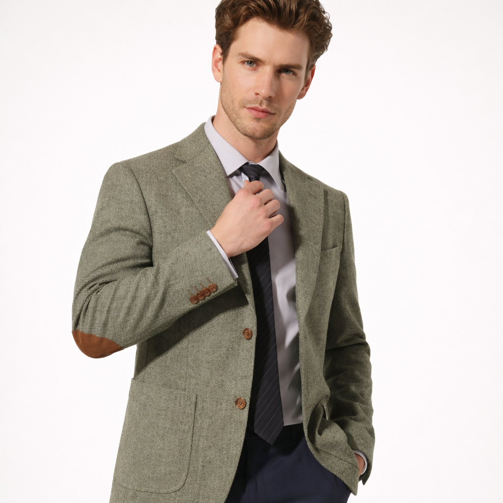Klassisk britisk herreblazer i fiskeben (ullblanding) – college-stil med albuelapper, single breasted (høst/vinter)