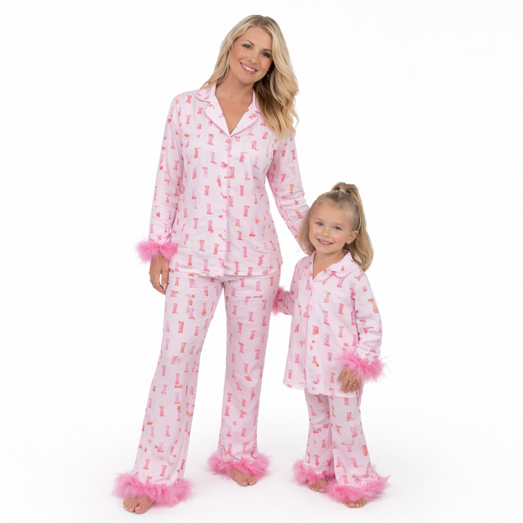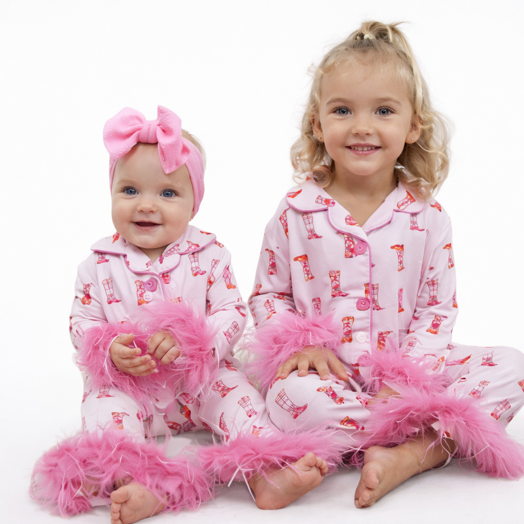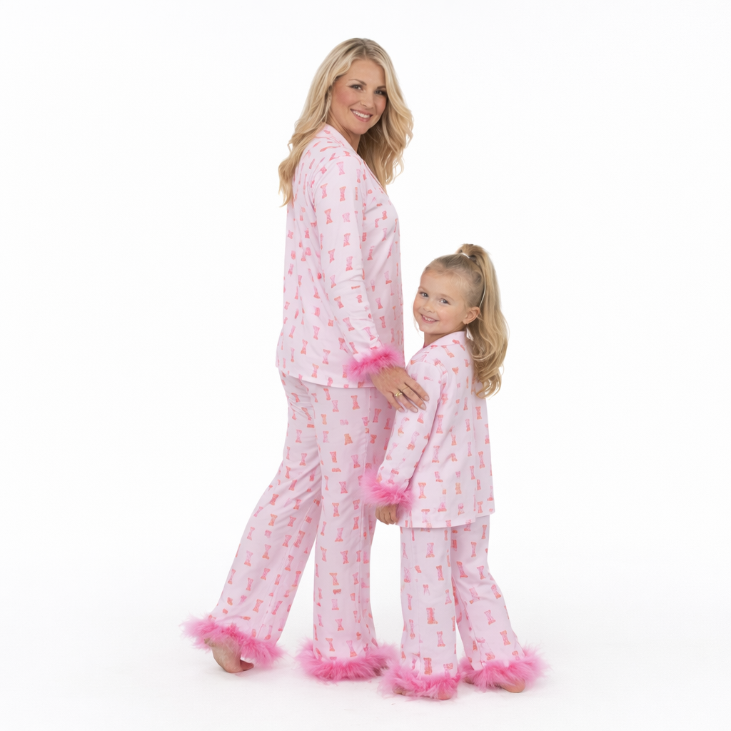 Matchende pysjamas for mamma og barn – 2-delt sett med fjærmansjetter og cowgirl-boot print (skjorte + bukse)