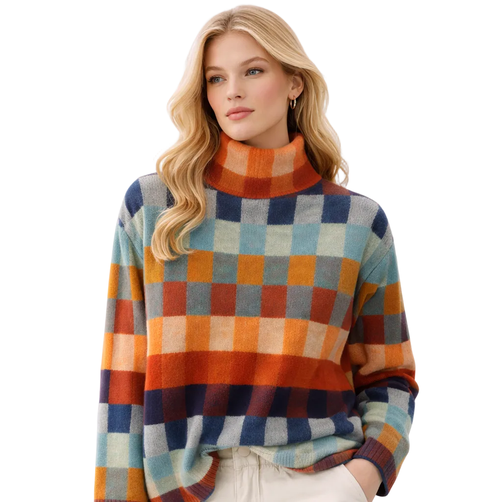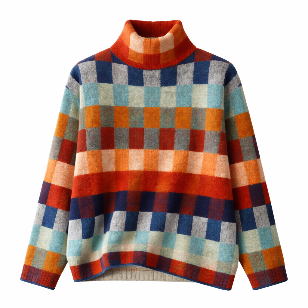 Streetwear Høyhalset Genser – Ruter & Kontrastfarger | Løs, Trendy & Varm Høst/Vinter