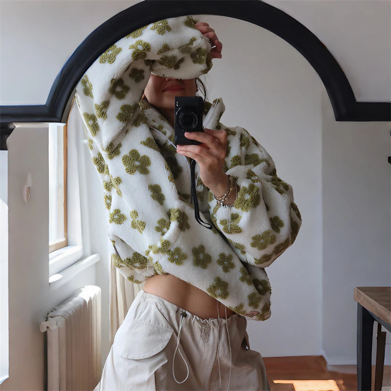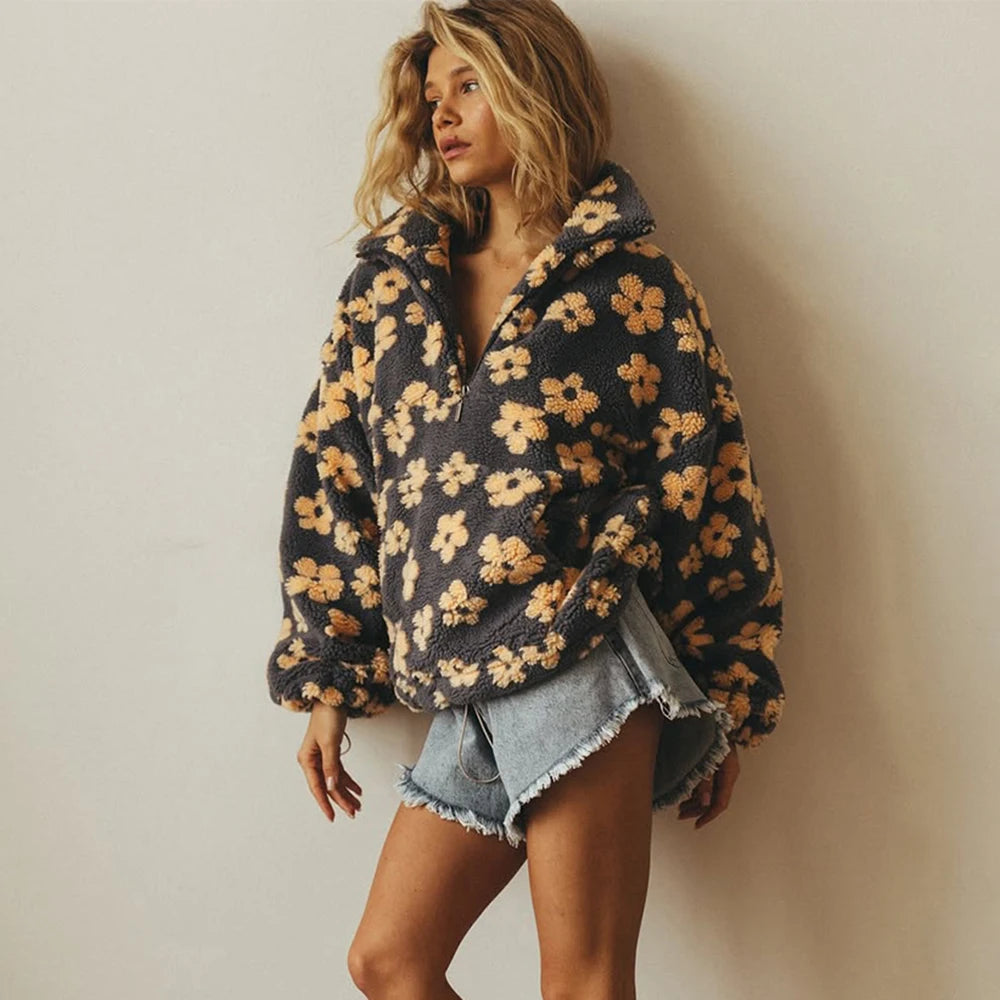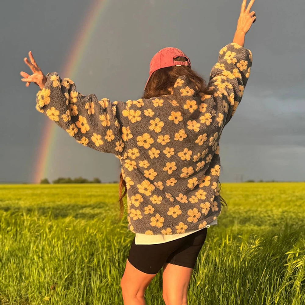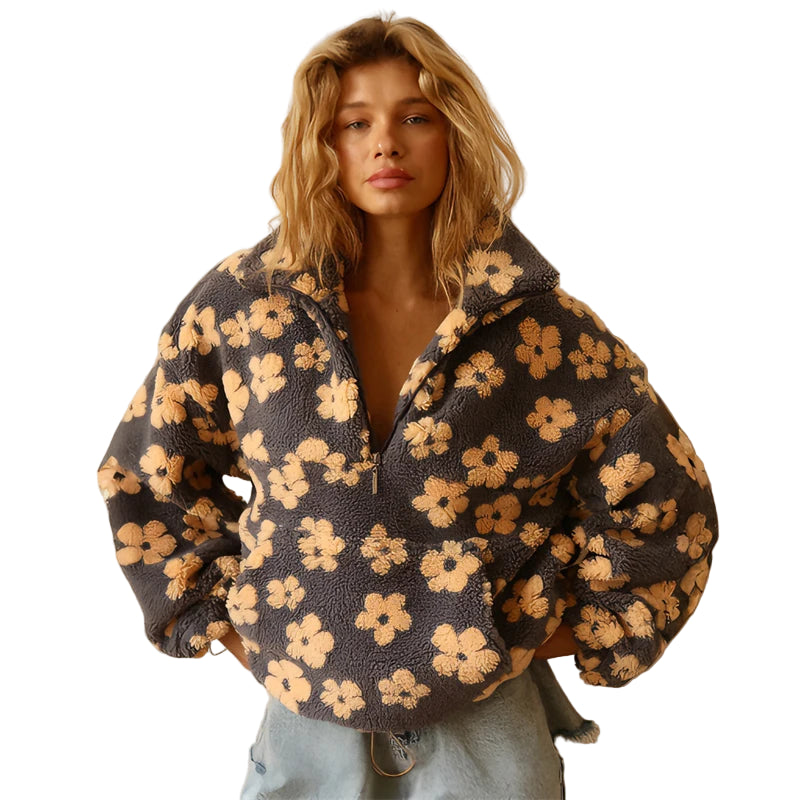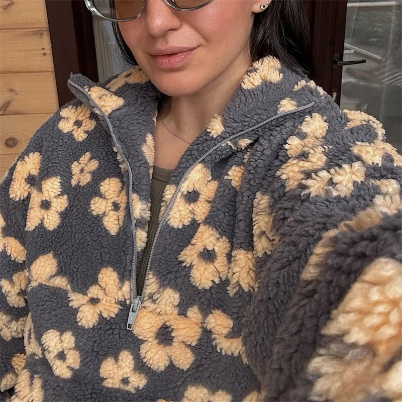 Gi garderoben et friskt pust av både komfort og stil med denne blomstrete hettejakken i imitert lammeull fra. Jakken kombinerer den myke, fluffy følelsen av teddyfleece med et moderne blomsterprint – en perfekt balanse mellom kos og mote.