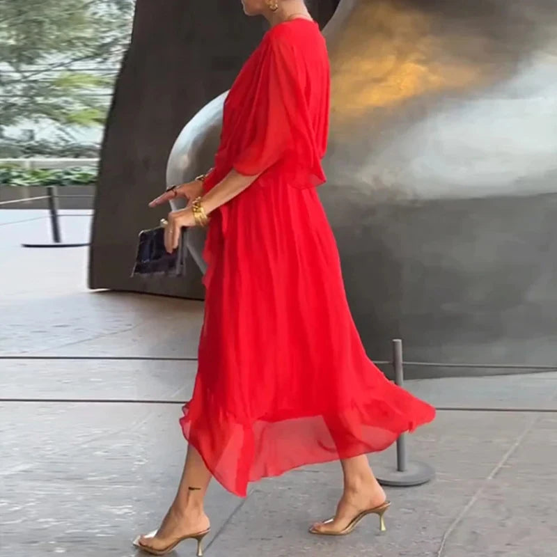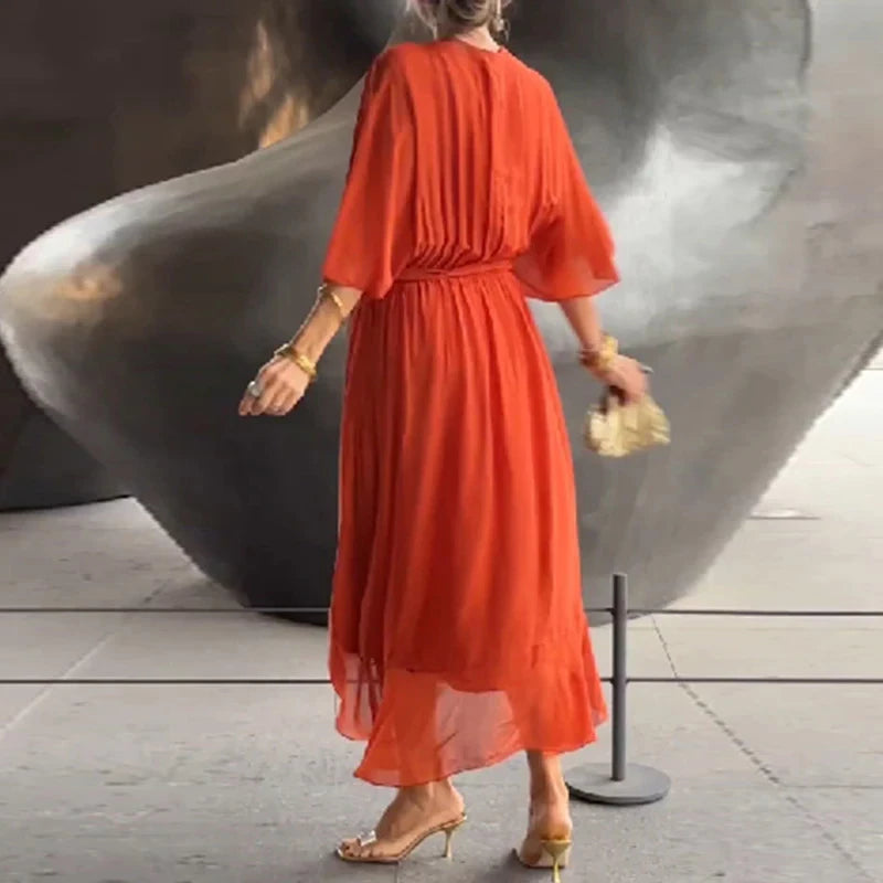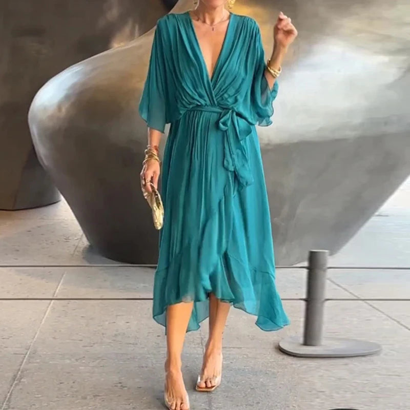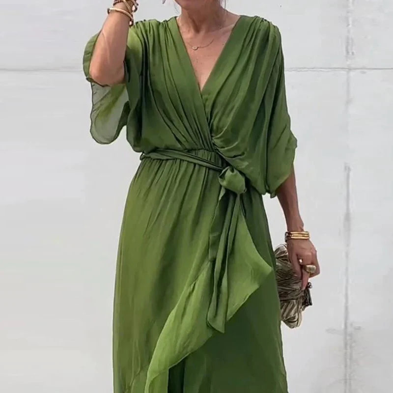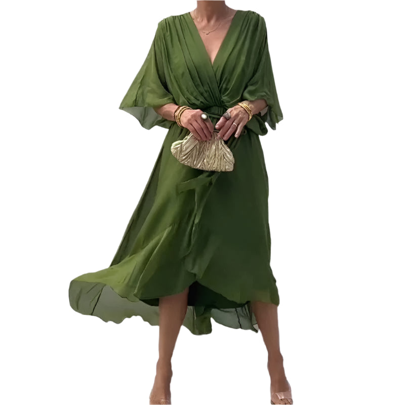 Denne elegante og luftige maxikjolen er perfekt for deg som ønsker en avslappet, men samtidig sensuell og feminin stil. Med dyp V-hals, løse flaggermusermer, knyting i midjen og et asymmetrisk skjørt, gir den deg en vakker bohemsk silhuett som passer like godt til sommerfester som til strandturer og reiser.