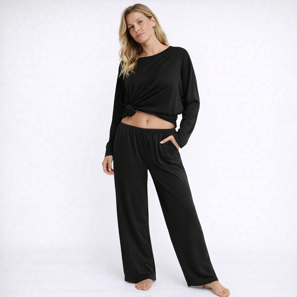 Nyt komfort og enkel eleganse med dette myke pysjsettet for kvinner, perfekt for avslappede kvelder og rolige morgener. Settet består av en langermet topp med rund hals og matchende bukse i løstsittende passform, som gir deg bevegelsesfrihet og en følelse av total avslapning.