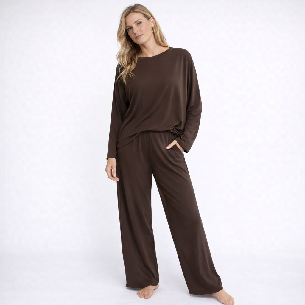 Dette pysjsettet gir deg ren komfort med en elegant enkelhet. Det føles mykt, ser stilig ut og passer perfekt til rolige dager – et must-have for kvinner som verdsetter komfort og tidløs design.