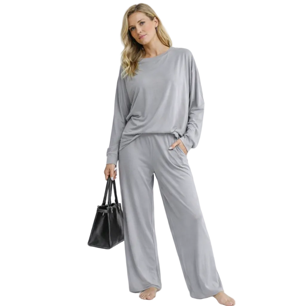 Dame Pysjsett i Ensfarget Design – Rund Hals og Lange Ermer | Mykt og Løst Hjemmetøy til Høst og Vinter