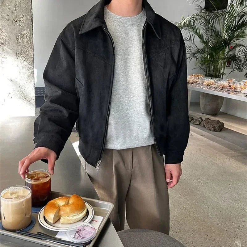 Elegant Brun Herrejakke – Vintage Kort Jakke med Glidelås og Løs Passform