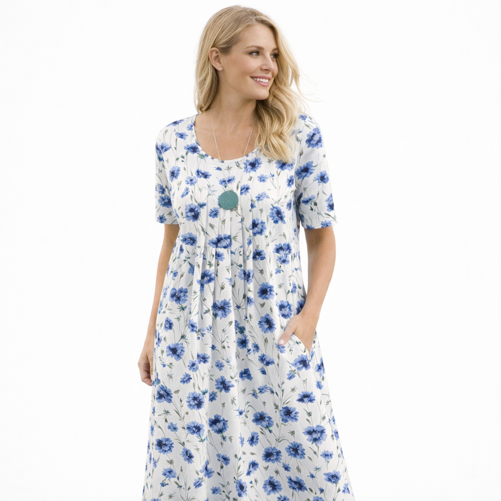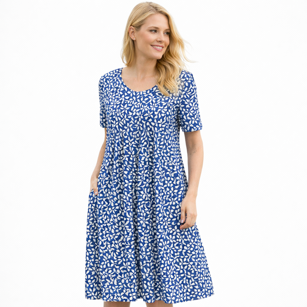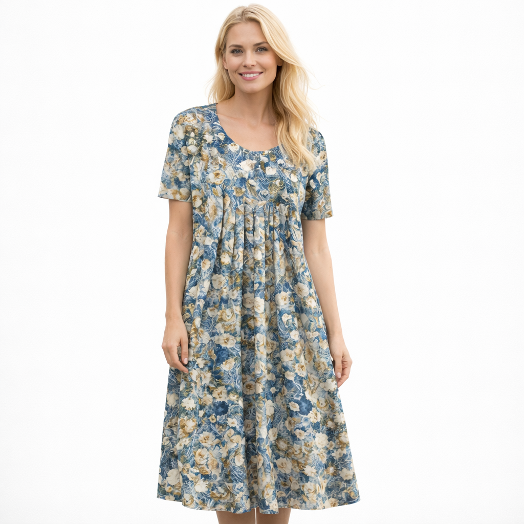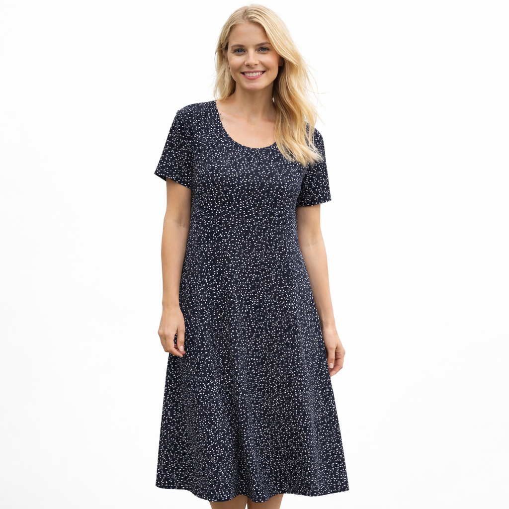 Gå sommeren i møte med denne elegante og feminine kjolen – perfekt for deg som elsker komfort, stil og en flatterende passform. Kjolen har en klassisk rund hals, korte ermer og et vidt skjørt som gir en lett og luftig følelse. Den vakre printen gir kjolen et friskt og sofistikert preg – perfekt til både hverdag og spesielle anledninger.