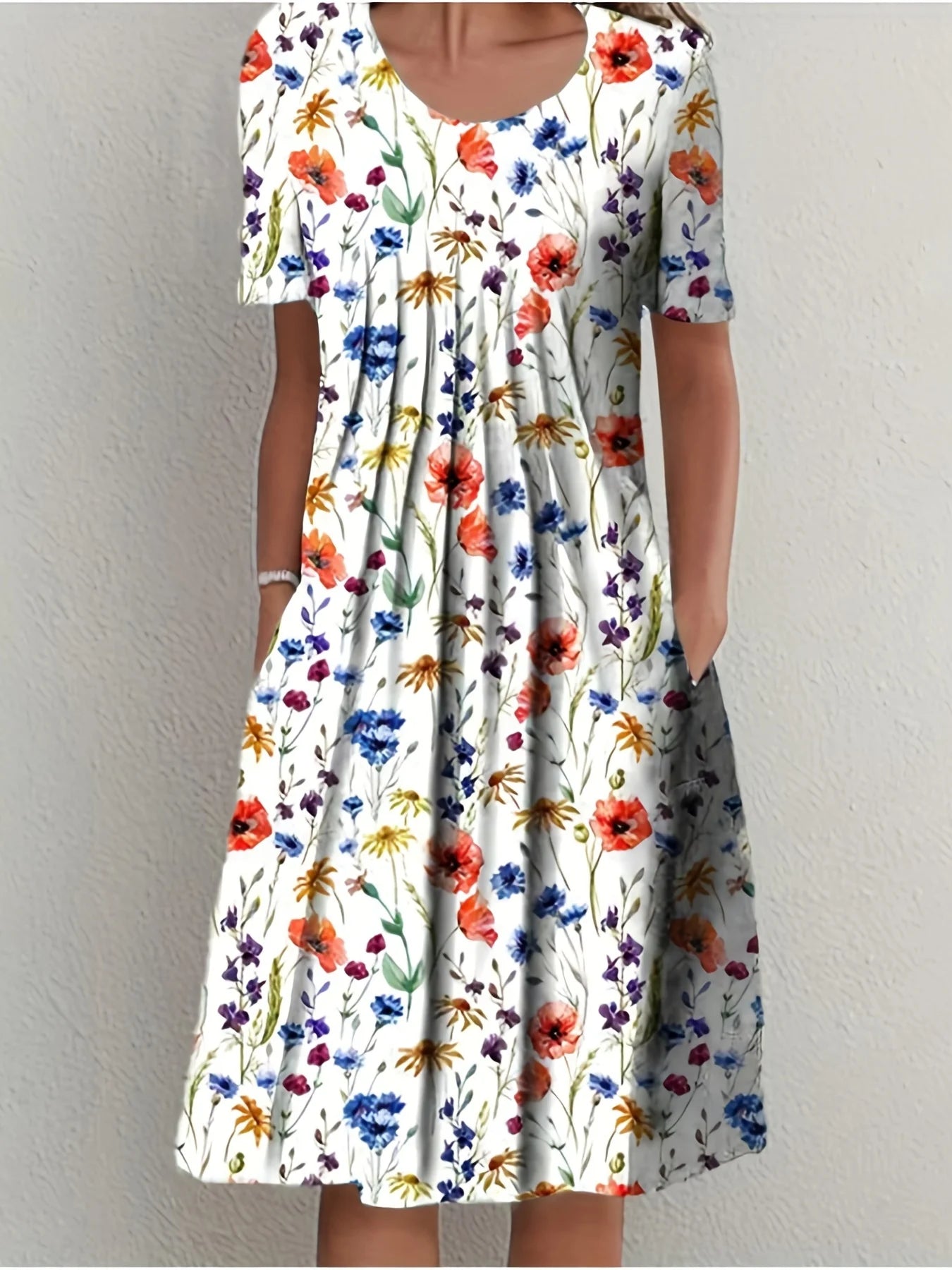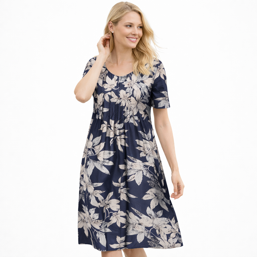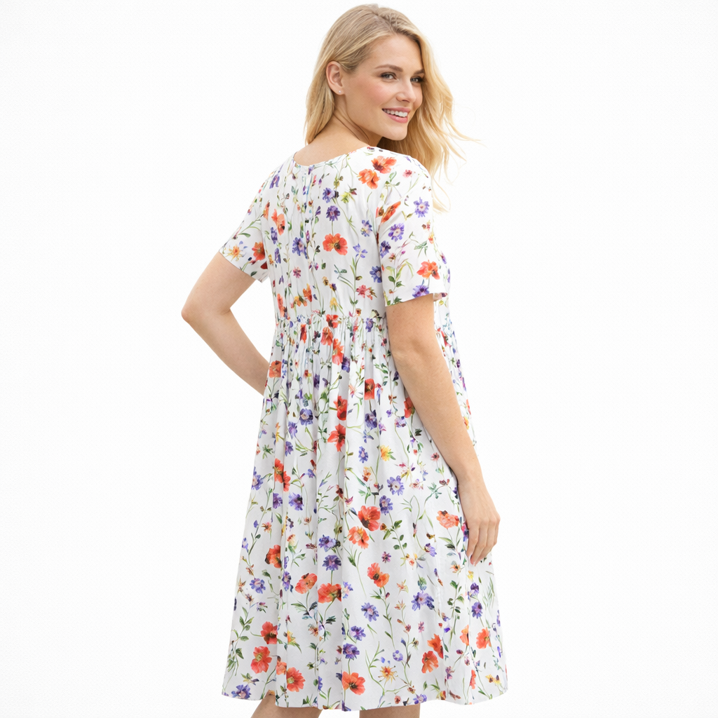 Gå sommeren i møte med denne elegante og feminine kjolen – perfekt for deg som elsker komfort, stil og en flatterende passform. Kjolen har en klassisk rund hals, korte ermer og et vidt skjørt som gir en lett og luftig følelse. Den vakre printen gir kjolen et friskt og sofistikert preg – perfekt til både hverdag og spesielle anledninger.