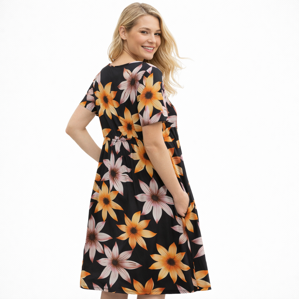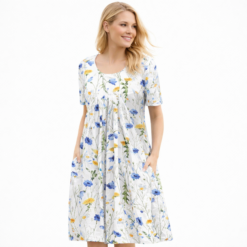 Elegant Sommerkjole med Vidt Skjørt – Rund Hals og Kort Erm med Blomsterprint (2024 Nyhet)