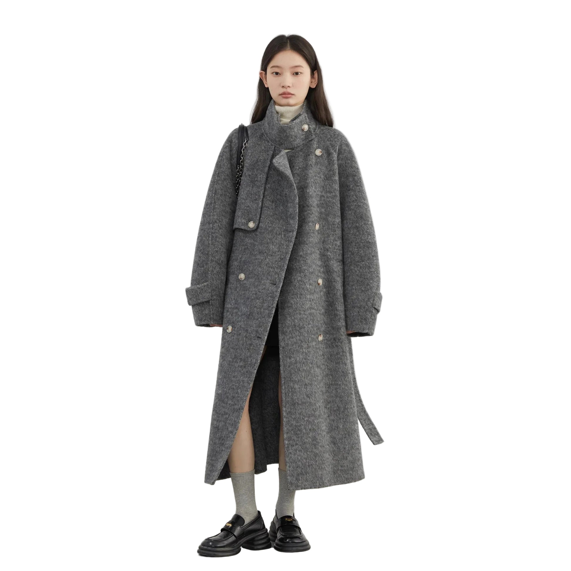 Opplev klassisk eleganse og tidløs komfort med denne dobbelsidige ullkåpen for dame, designet for deg som ønsker å kombinere stil, varme og raffinement. Denne kåpen har en ren og minimalistisk silhuett med ståkrage, som gir et sofistikert uttrykk – perfekt for både kontor og hverdag.