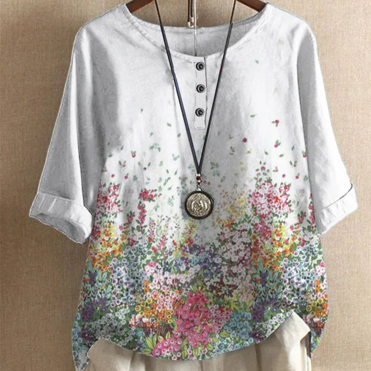 Blusen har en klassisk O-hals og halvlange ermer som gjør den luftig og behagelig å ha på. Det fargerike mønsteret gir et bohemsk og Harajuku-inspirert uttrykk som enkelt kan kombineres med jeans, linbukser eller shorts.