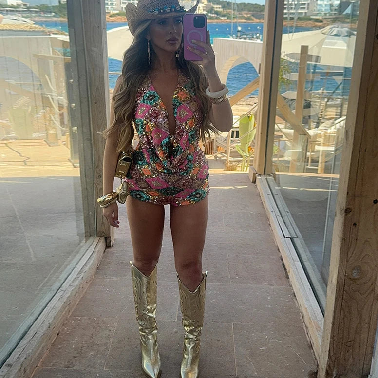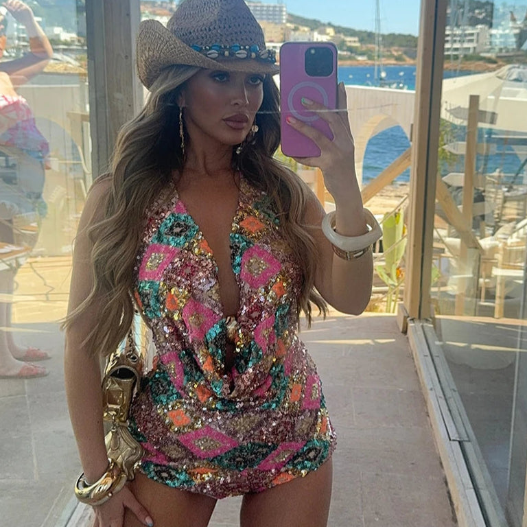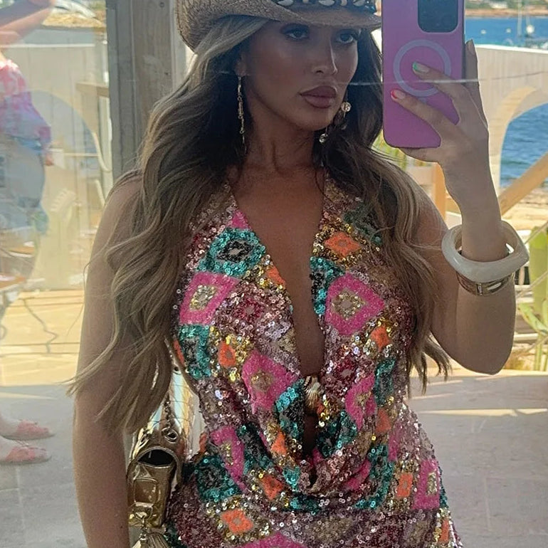 Gjør deg klar til å glitre hele kvelden med dette fargerike paljettsettet som garantert stjeler oppmerksomheten. Dette todelte antrekket består av en ermeløs, backless halterneck-vest med dyp utringning og et figurnært bodycon-miniskjørt – designet for å fremheve former og gi deg en selvsikker, glamorøs look.