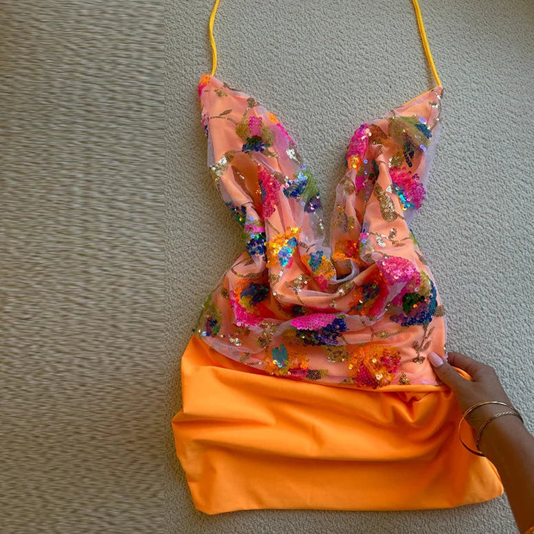 Paljettene skaper et lekent spill av farger som skinner vakkert i lyset, perfekt for sommerfester, nattklubber, festivaler eller spesielle anledninger der du ønsker å være midtpunktet. Stoffet er behagelig mot huden, samtidig som det gir en elegant, tettsittende passform som holder seg på plass hele kvelden.
