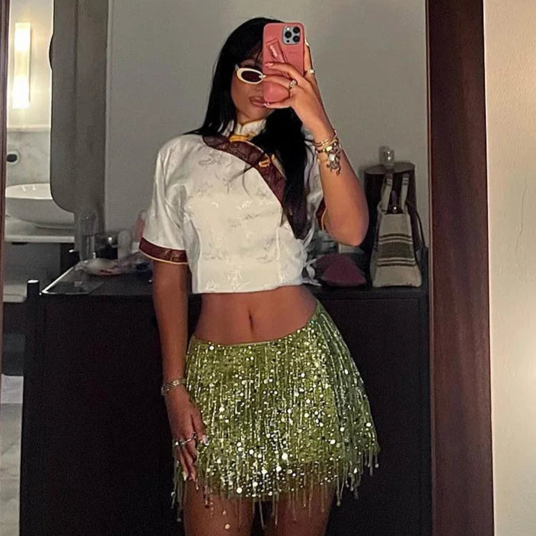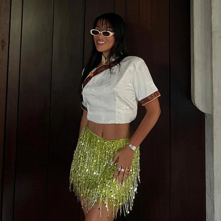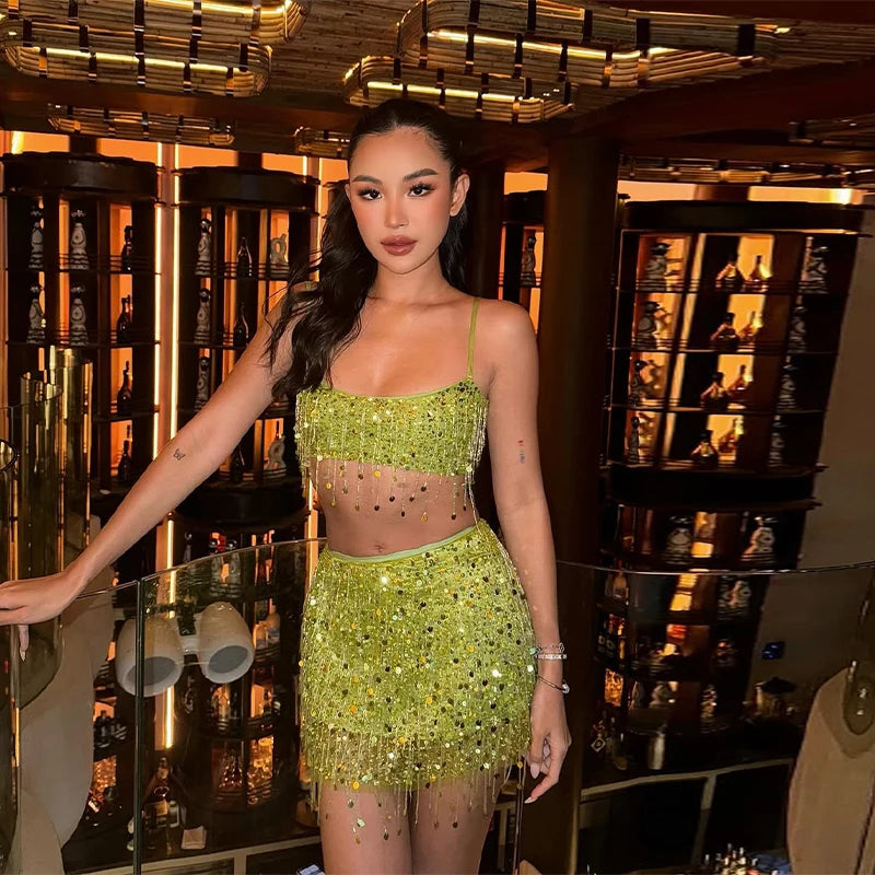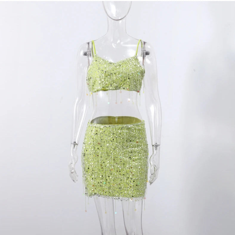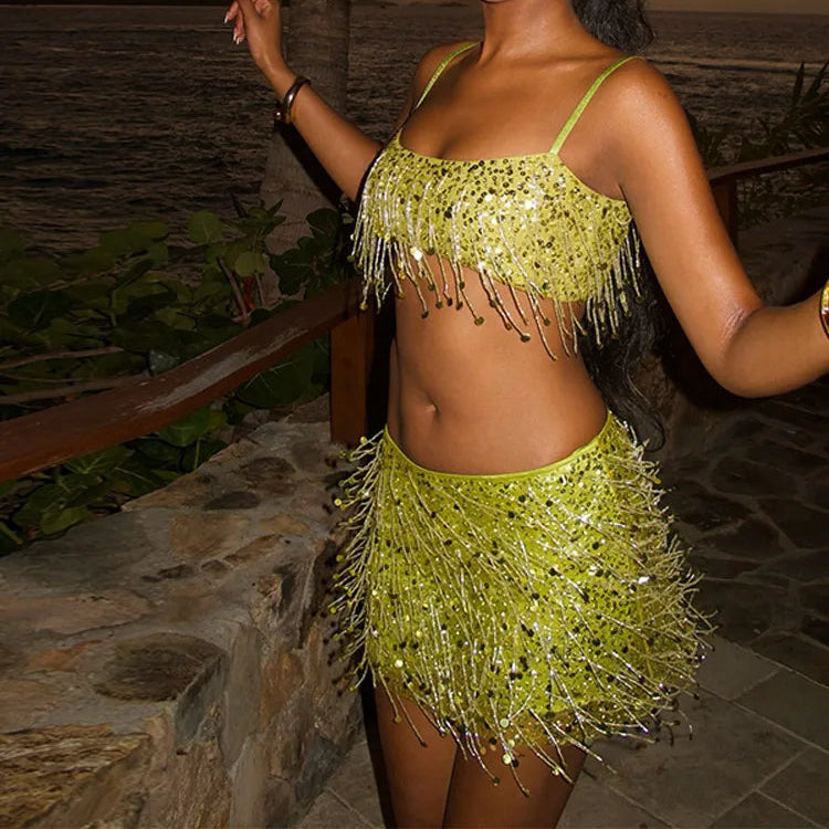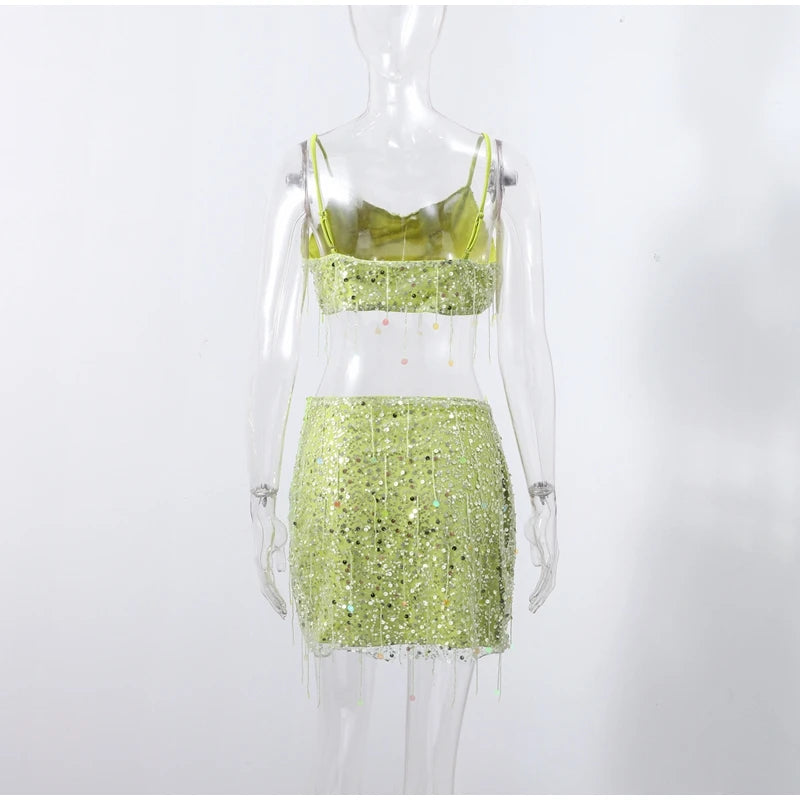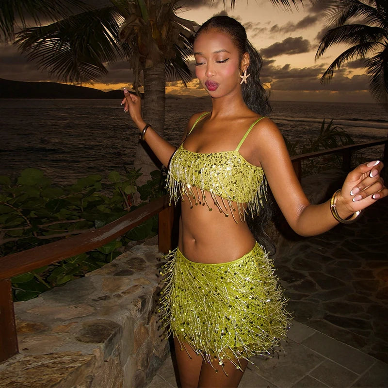 Fang oppmerksomheten på stranden, festivalen eller sommerens heteste fester med dette glitrende Ibiza-inspirerte settet. Settet består av en ermeløs, backless topp dekket av skinnende paljetter, kombinert med et matchende skjørt med lekne frynser som danser med hver bevegelse.