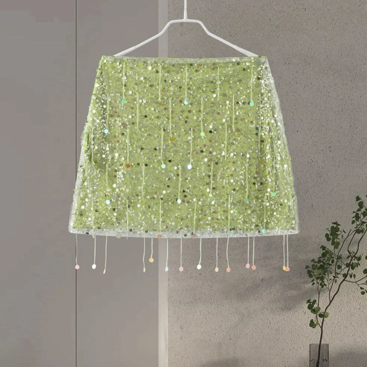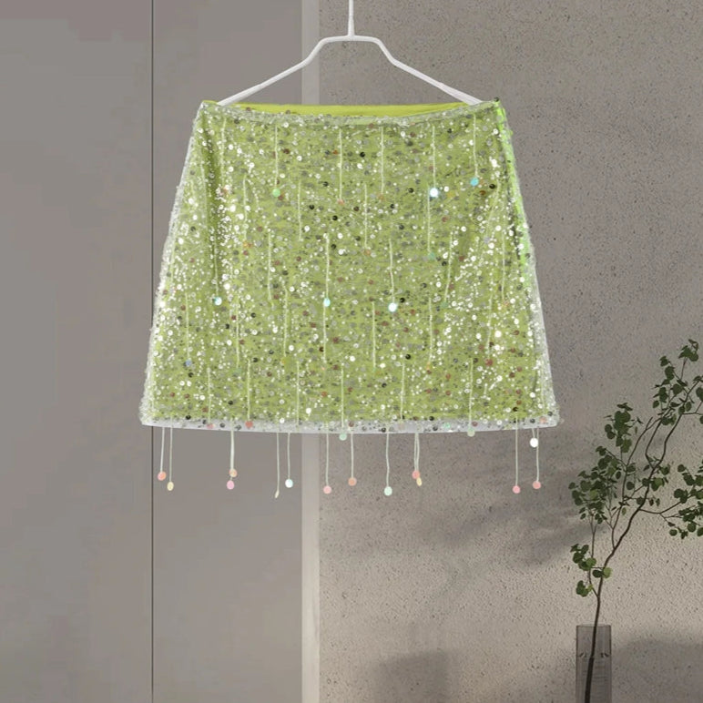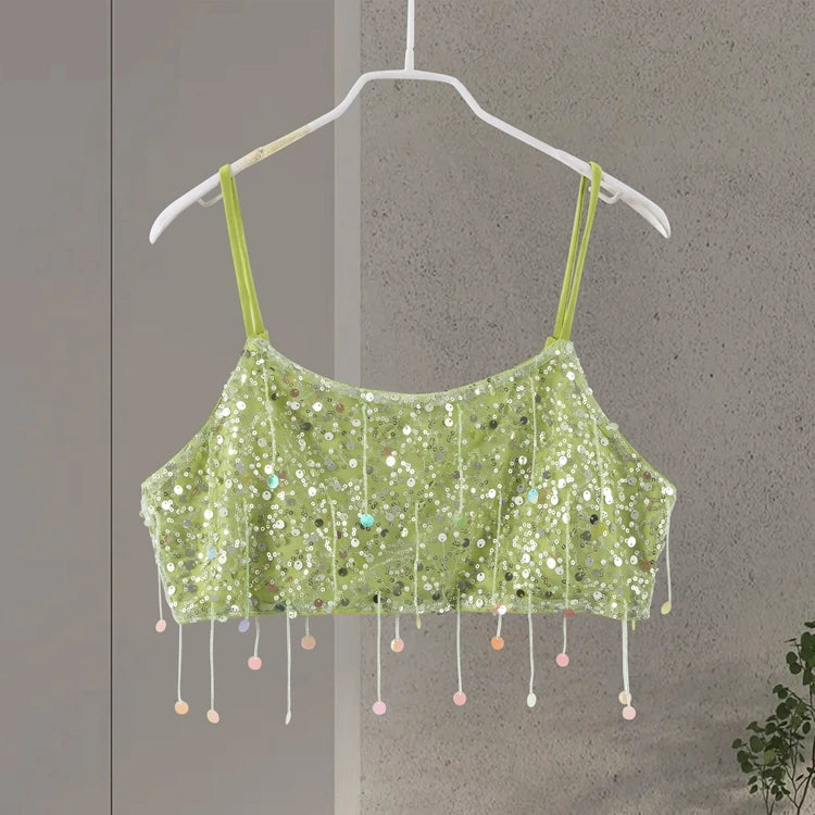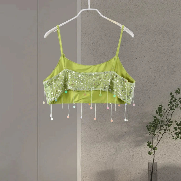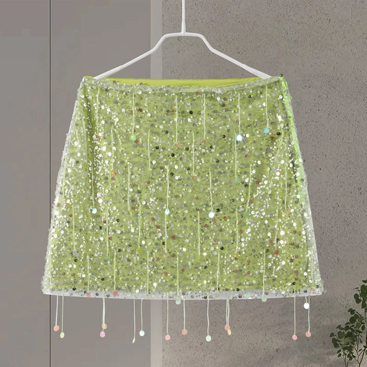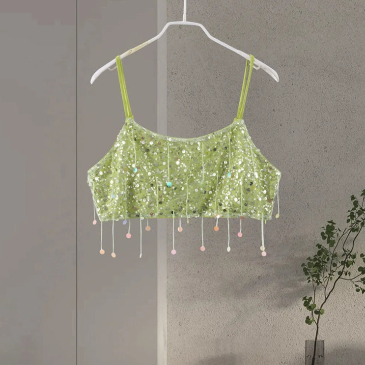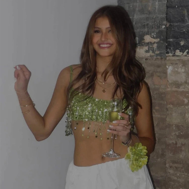 Fang oppmerksomheten på stranden, festivalen eller sommerens heteste fester med dette glitrende Ibiza-inspirerte settet. Settet består av en ermeløs, backless topp dekket av skinnende paljetter, kombinert med et matchende skjørt med lekne frynser som danser med hver bevegelse.