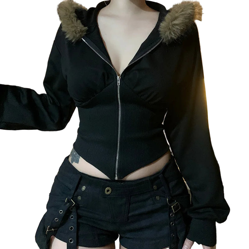 Gi vinterlooken et mørkt, elegant preg med denne gotisk-inspirerte vinterjakken med fuskepels og hette. Designet for deg som elsker unike plagg med attityde, kombinerer den feminin passform med et edgy uttrykk. Den figursydde midjen gir en flatterende silhuett, mens den myke fuskepelsen og den varme hetten sørger for komfort og stil på kalde dager.