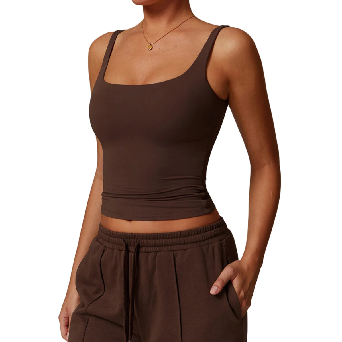 Det tettsittende designet former seg etter kroppen uten å føles stramt, og det pustende stoffet sørger for at du holder deg tørr og komfortabel selv under svette økter. Den unike kvadratiske halsutskjæringen gir et trendy, feminint uttrykk som skiller seg ut fra klassiske sportstopper, samtidig som den er enkel å style med både tights, shorts eller joggebukser.
