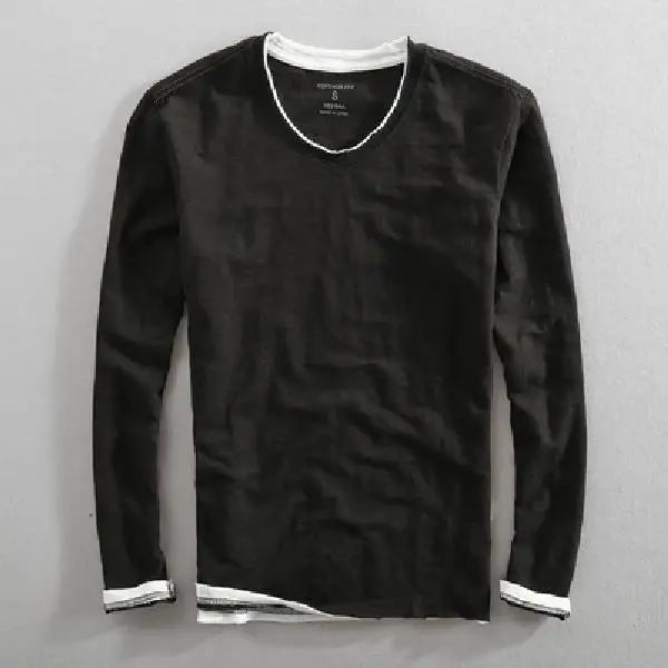 Herre Langermet T-skjorte i Bomull – V-hals med Vintage Detaljer