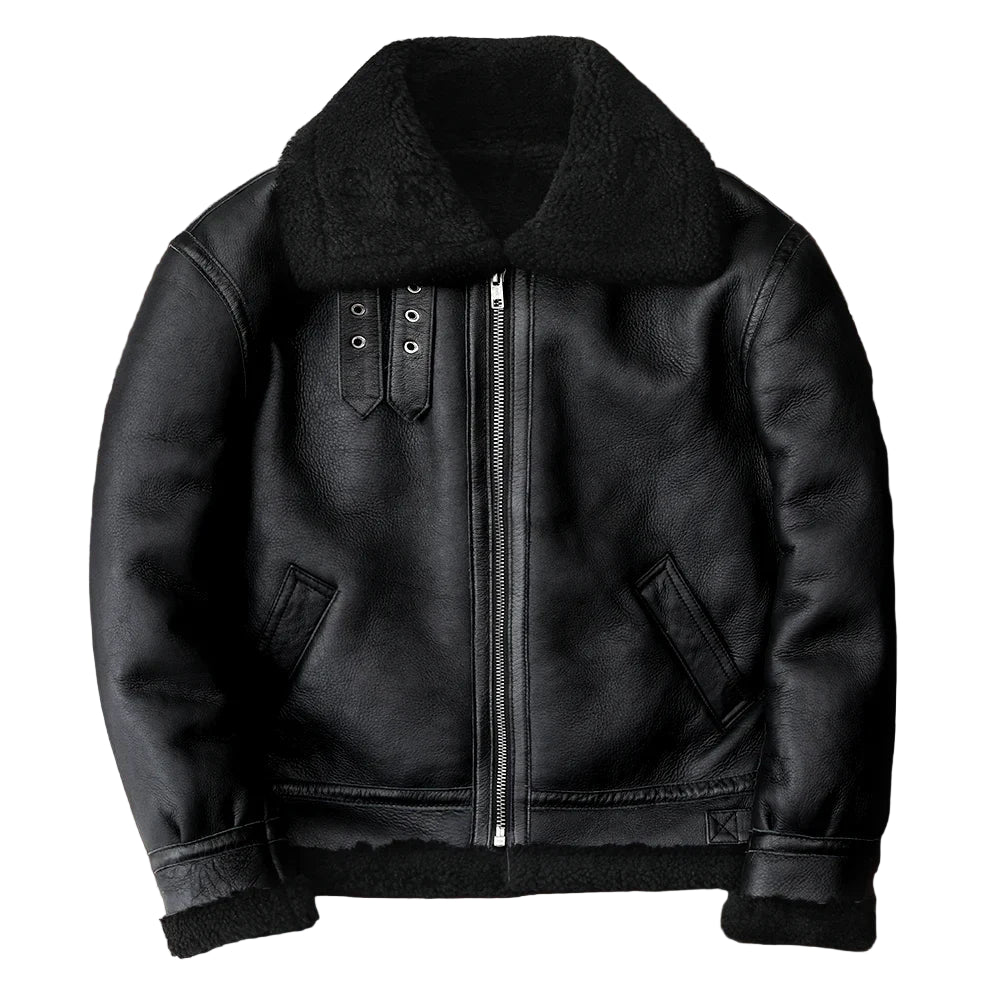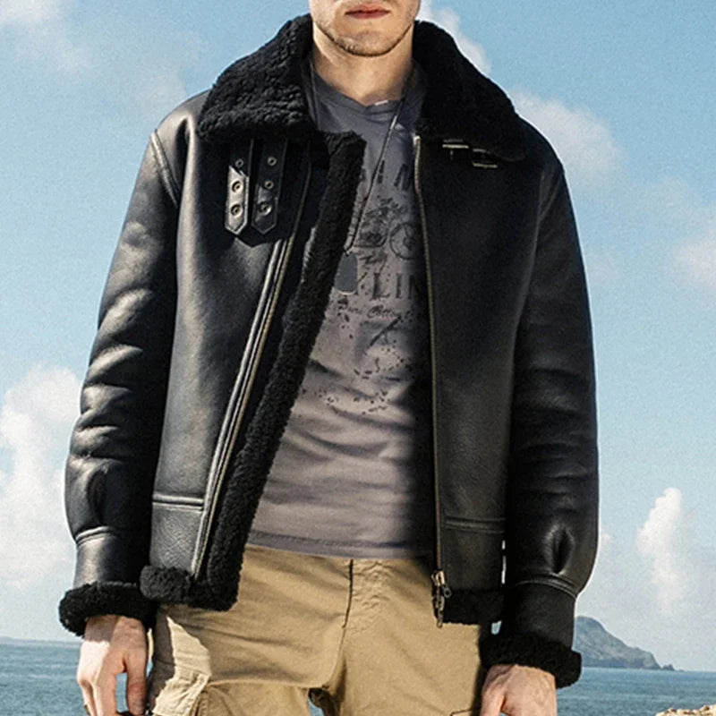 Herre Skinnjakke i Ekte Lammeskinn – Vinter Pilotjakke med Ullfôr | Klassisk Bomber med Naturlig Pelskrage