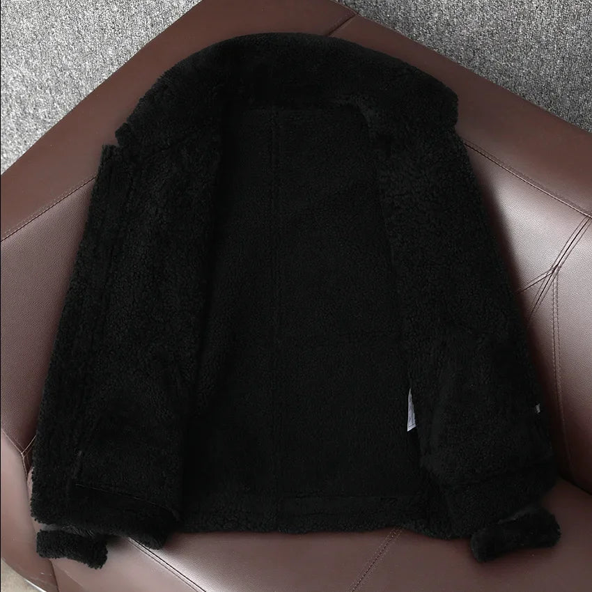 Den er laget av 100% ekte lammeskinn, kjent for sin slitestyrke, mykhet og evne til å holde på varmen uten å bli stiv. Innsiden er fôret med tykk ull, som isolerer effektivt mot kulde samtidig som den puster naturlig. Den klassiske pilotkragen med pels gir et eksklusivt preg og ekstra beskyttelse mot vind.