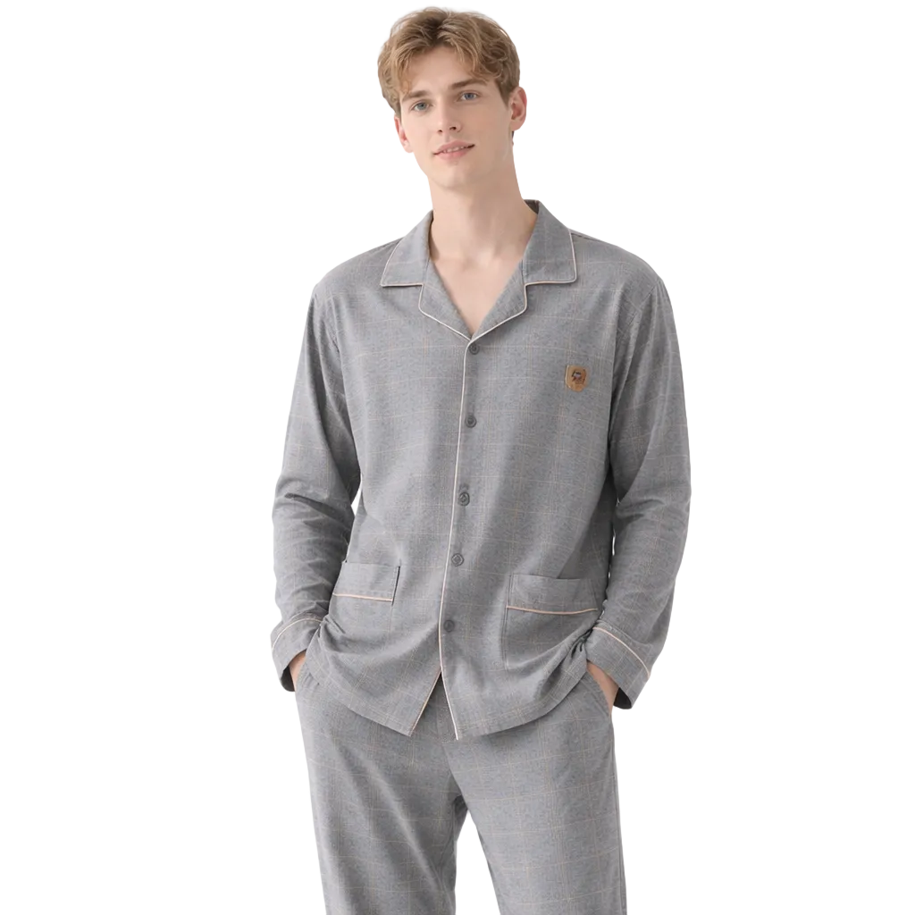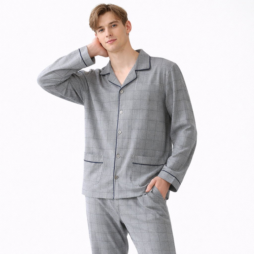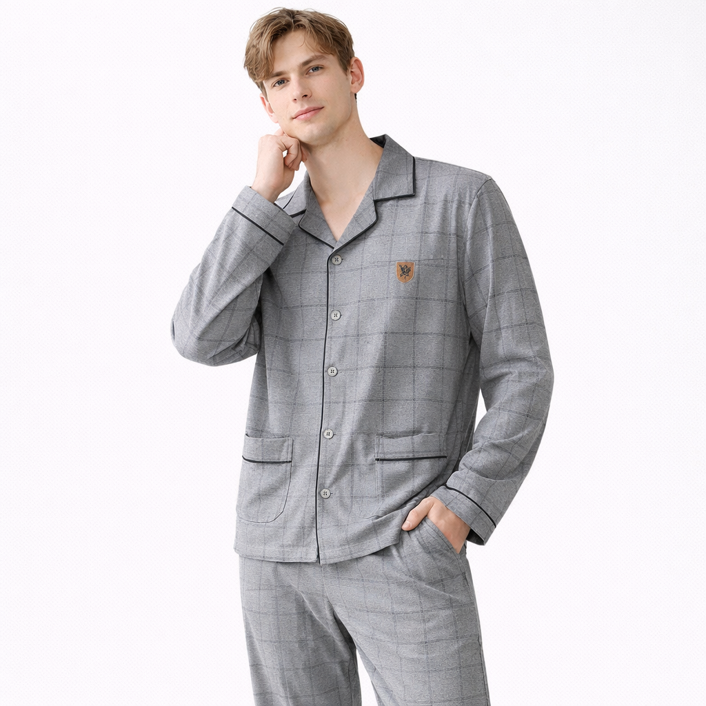 Vil du ha en herrepysj som ser litt mer “ordentlig” ut, men fortsatt er skikkelig behagelig? Dette grå rutete pysjamasettet er et klassisk og tidløst valg til vinter og kjølige kvelder. Settet består av en langermet overdel med krage (turn-down collar) og matchende bukse – perfekt både som nattøy og som loungewear når du vil slappe av hjemme.