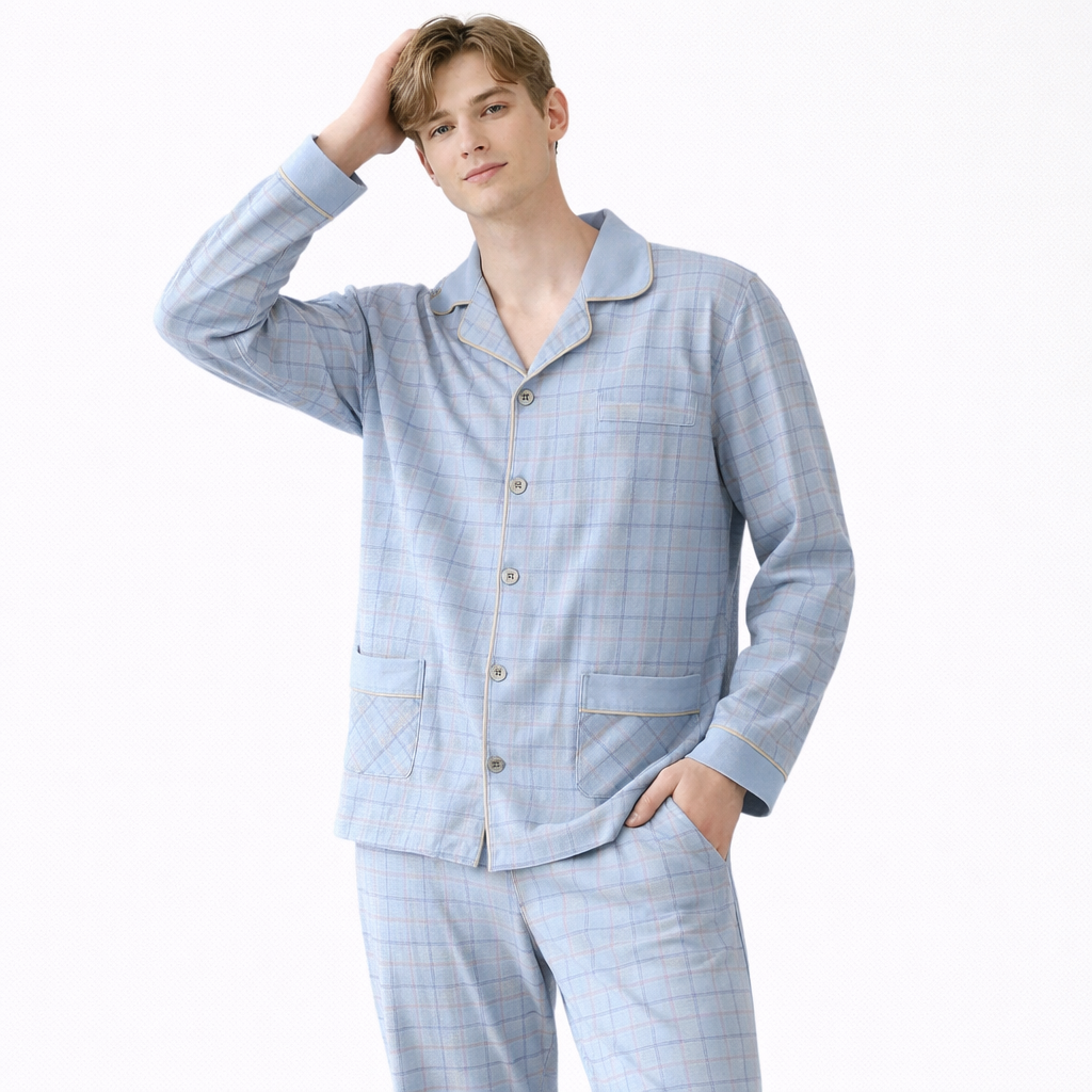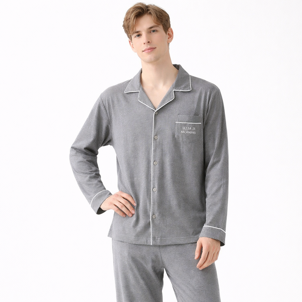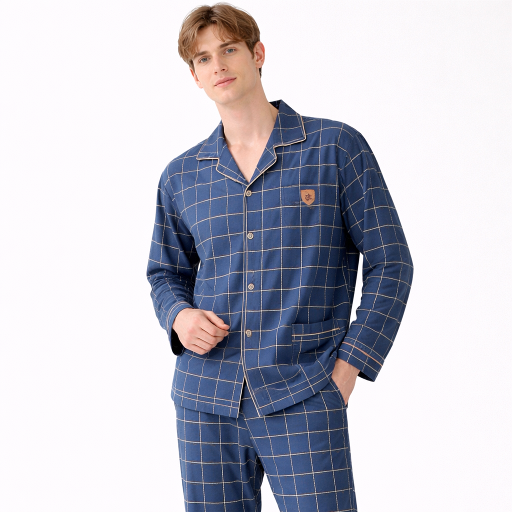 Vil du ha en herrepysj som ser litt mer “ordentlig” ut, men fortsatt er skikkelig behagelig? Dette grå rutete pysjamasettet er et klassisk og tidløst valg til vinter og kjølige kvelder. Settet består av en langermet overdel med krage (turn-down collar) og matchende bukse – perfekt både som nattøy og som loungewear når du vil slappe av hjemme.