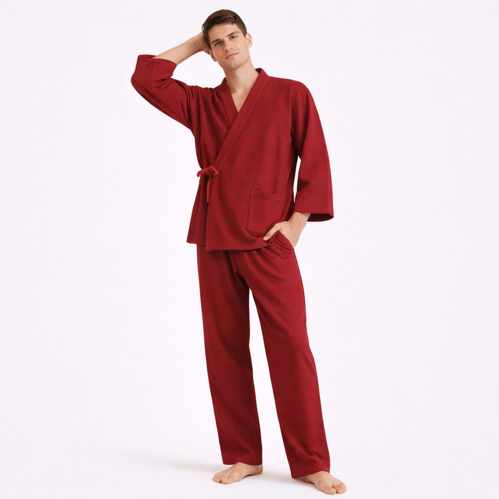 Japansk Pysjsett for Menn – 100 % Bomull i Tykt Luftlagstoff | Varmt Kimono-inspirert To-delt Nattøy til Høst og Vinter