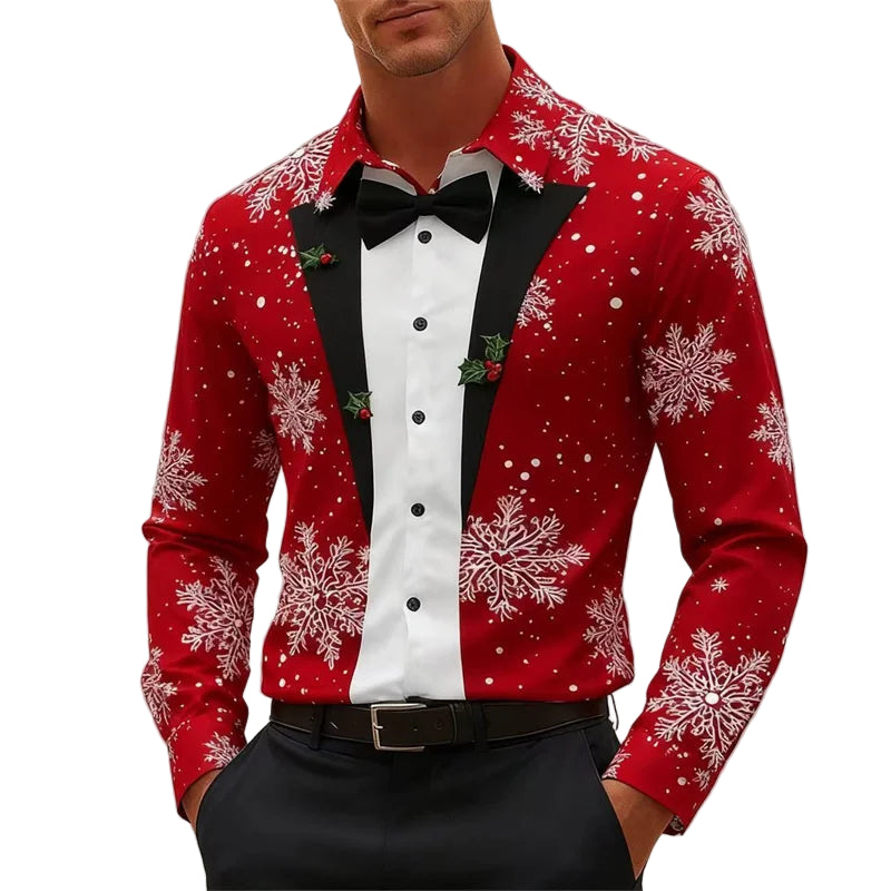 Jule Skjorte for Menn – Langermet Skjorte med Sløyfe og Snøfnuggmønster | Festlig og Komfortabel Skjorte til Jul og Nyttår