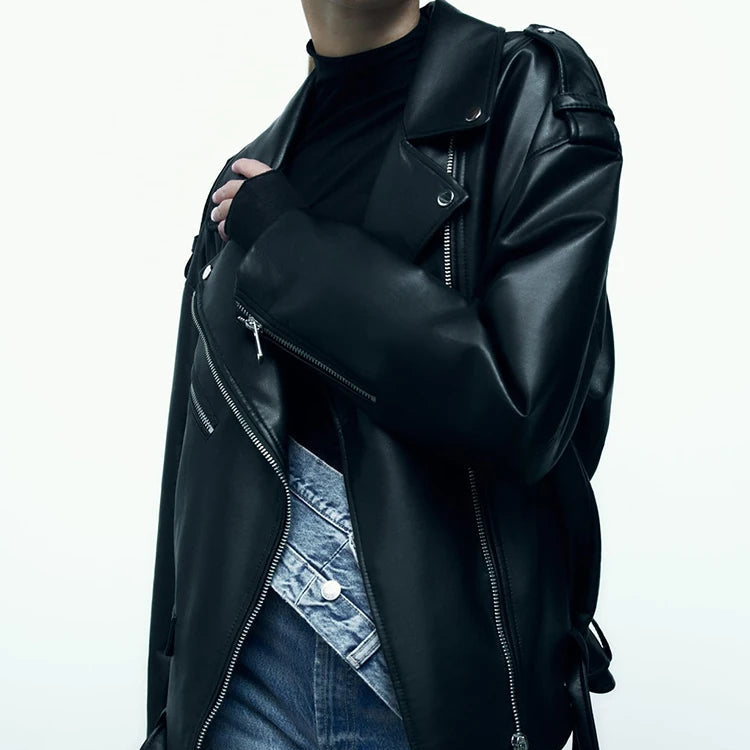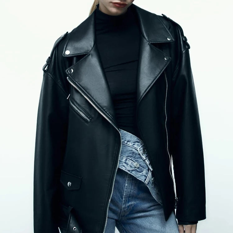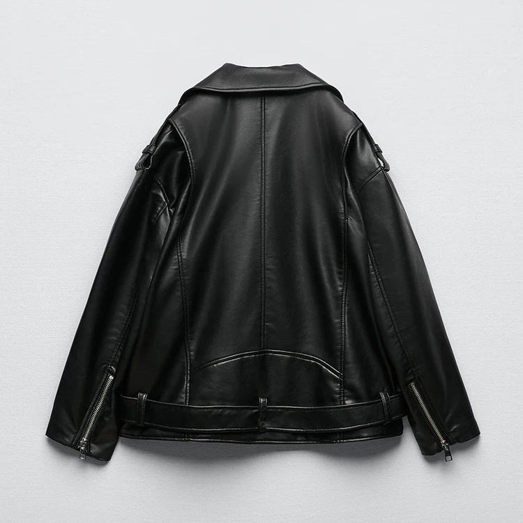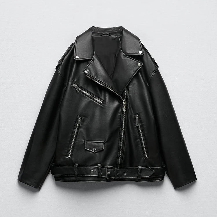 Klassisk Bikerjakke for Dame – Løs Skinnjakke i PU med Belte og Glidelås | Trendy Vår- og Høstjakke