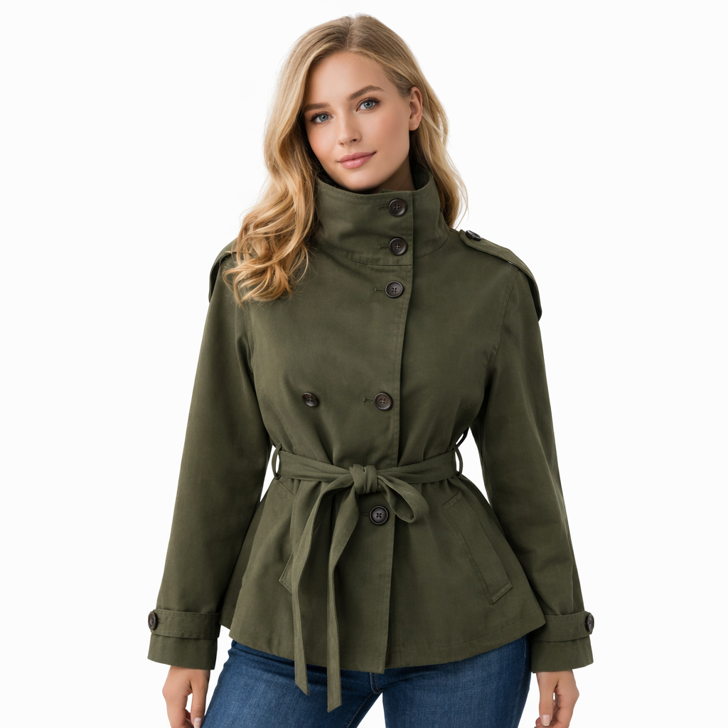 Kort Trenchcoat for Dame – Elegant Dobbelspent Jakke med Belte i Midjen og Ståkrage | Trendy Høstjakke