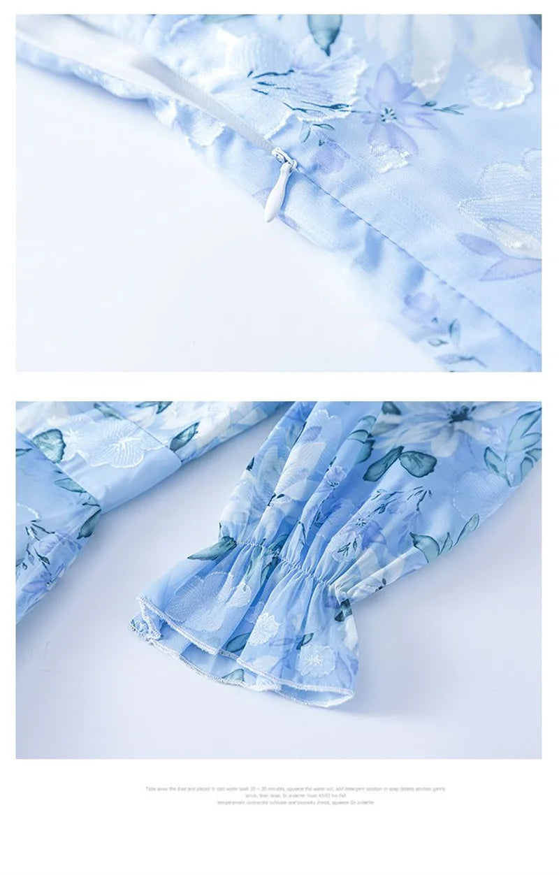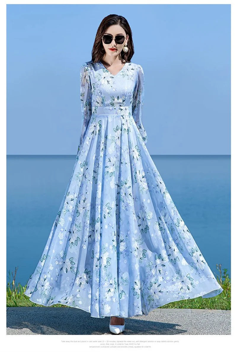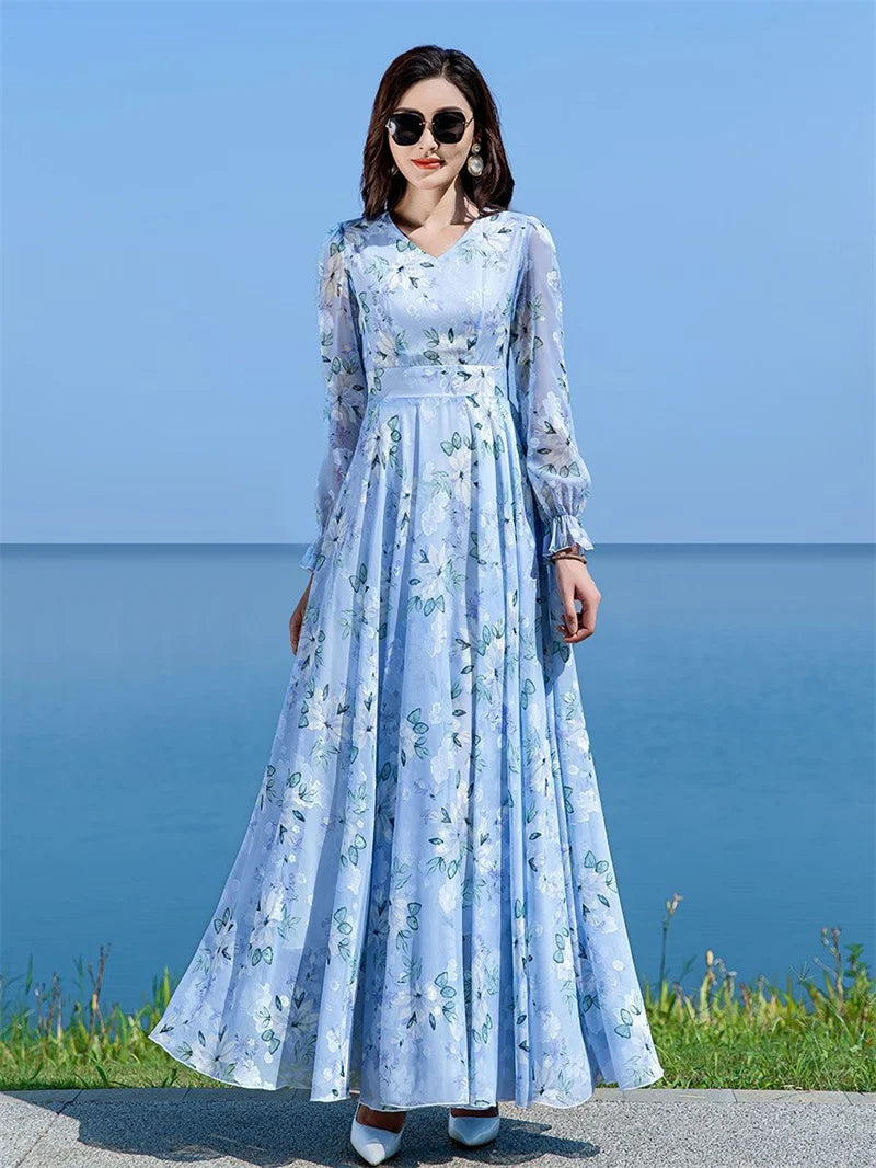 Kjolen har lange, luftige ermer og en vakker V-utringning som gir et sofistikert uttrykk. Den markerte midjen fremhever figuren på en flatterende måte, mens det store svingende skjørtet gir kjolen en romantisk og leken bevegelse når du går. Laget i lett og pustende chiffon – ideell for vårlige dager, sommerfester eller bryllup.