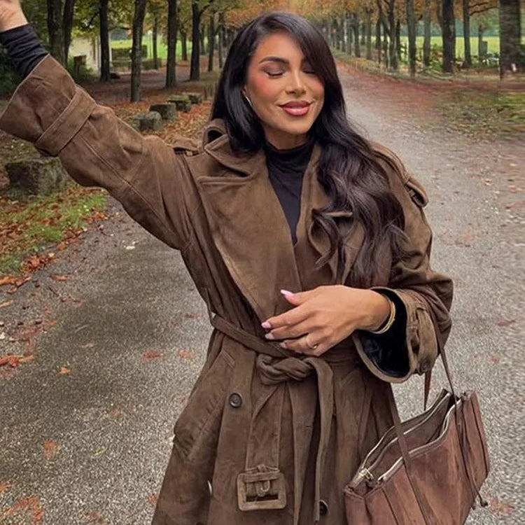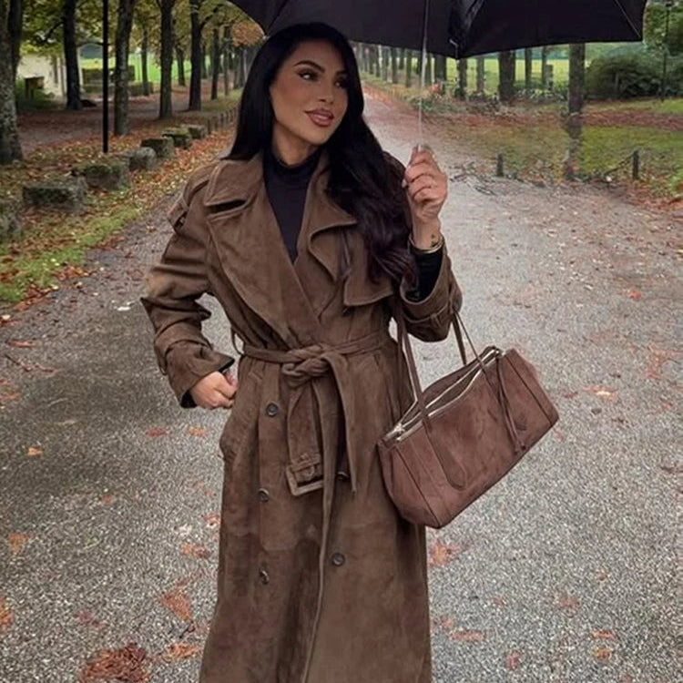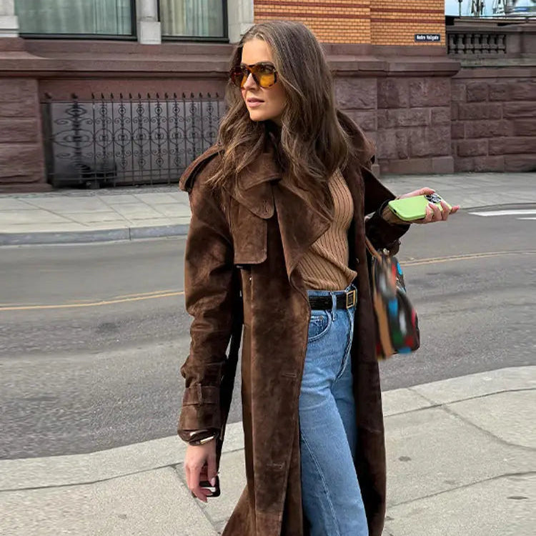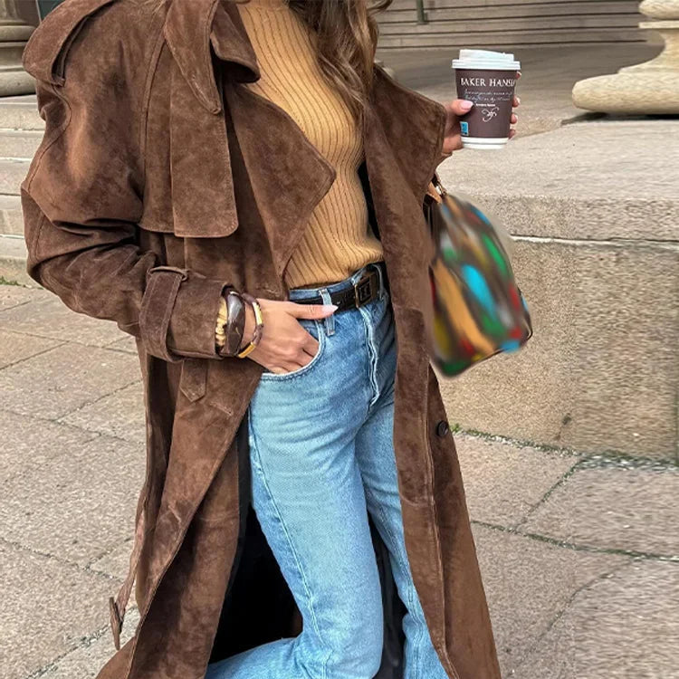 Gi antrekket ditt et sofistikert løft med denne lange semskede frakken for dame, inspirert av tidløs vintage-stil og moderne eleganse. Jakken er designet for å fremheve en feminin silhuett med sitt belte i livet og dobbeltspente snitt, samtidig som den holder deg varm og komfortabel gjennom hele høst- og vintersesongen.
