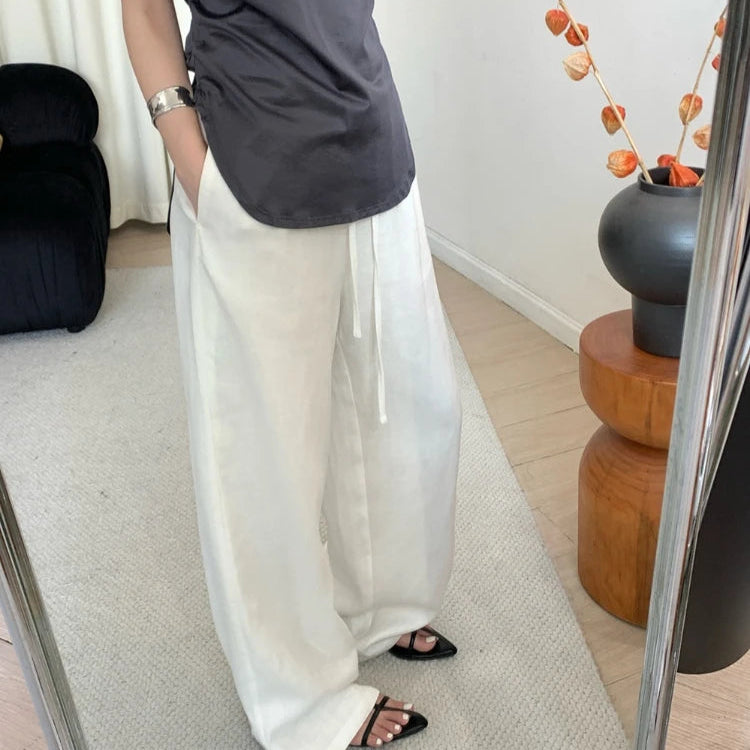 Den løse passformen og vide benstilen gir full bevegelsesfrihet, mens snøringen i midjen lar deg justere passformen etter ønske. Det tidløse designet gjør buksene enkle å style – enten du går for et minimalistisk, bohemsk eller koreansk-inspirert antrekk.