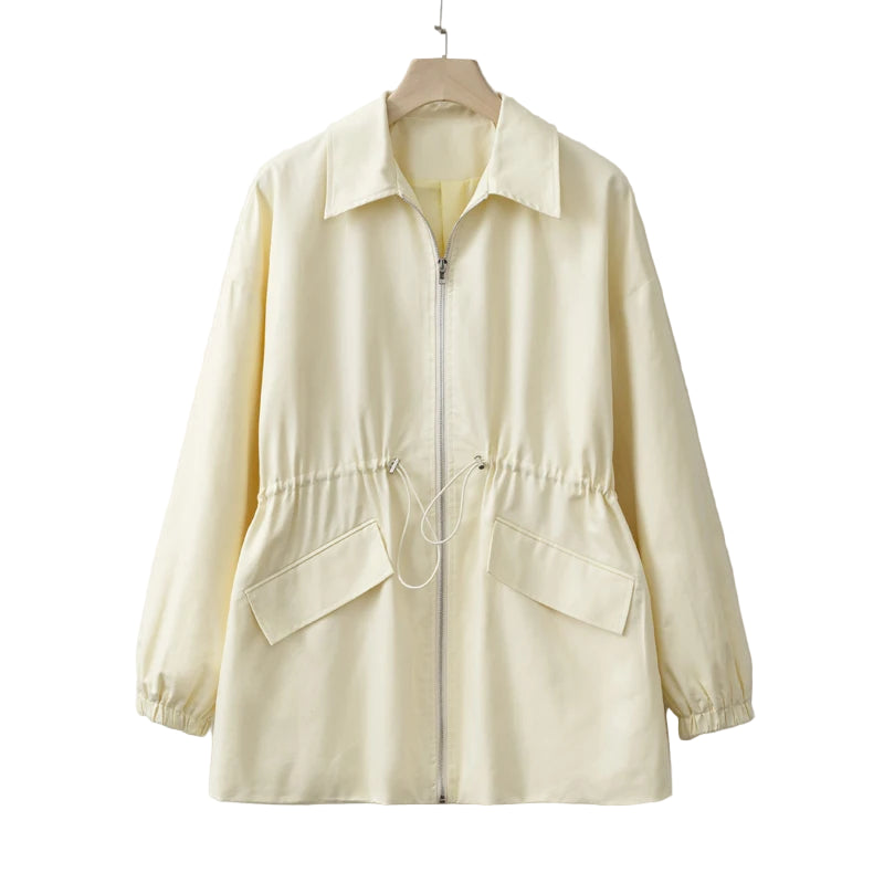 Denne lette og stilrene jakken i lys gul er perfekt for vår og høst – når du ønsker et ytterplagg som både er praktisk, flatterende og moderne. Jakken har en justerbar midje som lar deg forme passformen slik du ønsker, samtidig som glidelåsen i front gir et rent og sporty uttrykk.
