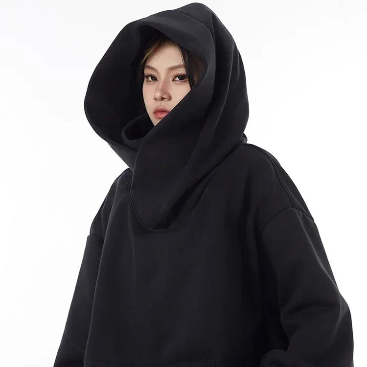 Ninja Hettegenser for Menn – Ensfarget Y2K Hoodie med Høy Hals | Oversized Streetwear i Fleece for Høst og Vinter