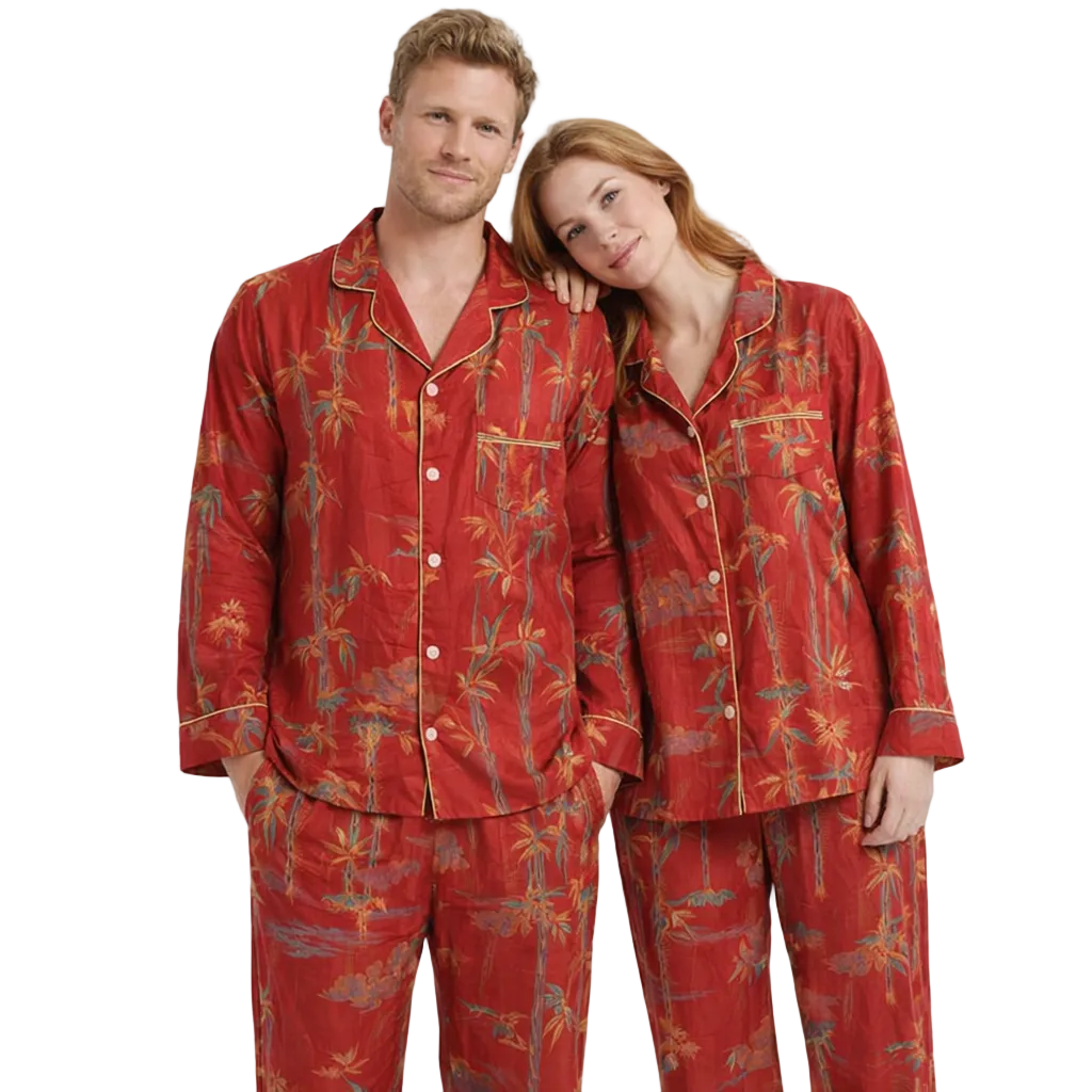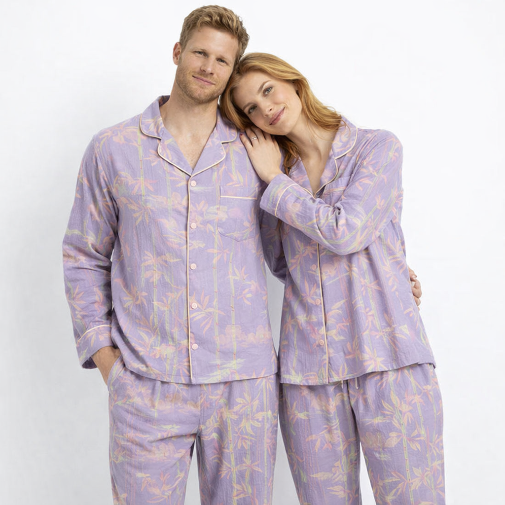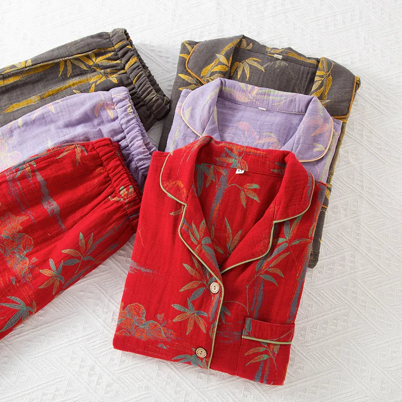 Par-Pysjamas i Bomullsmusselin (Dobbel Gasbind) – 2-delt Sett med Tynn Langermet Topp + Bukse | Vår/Sommer Loungewear