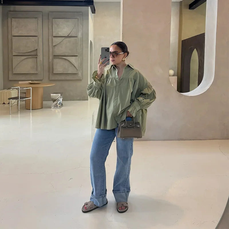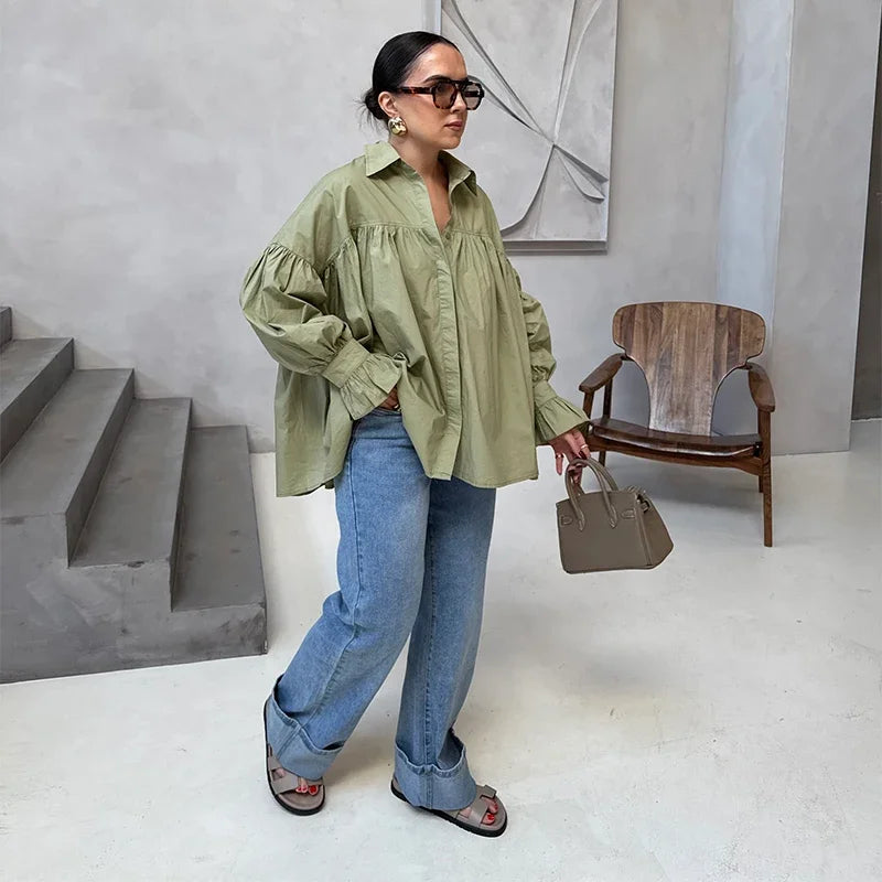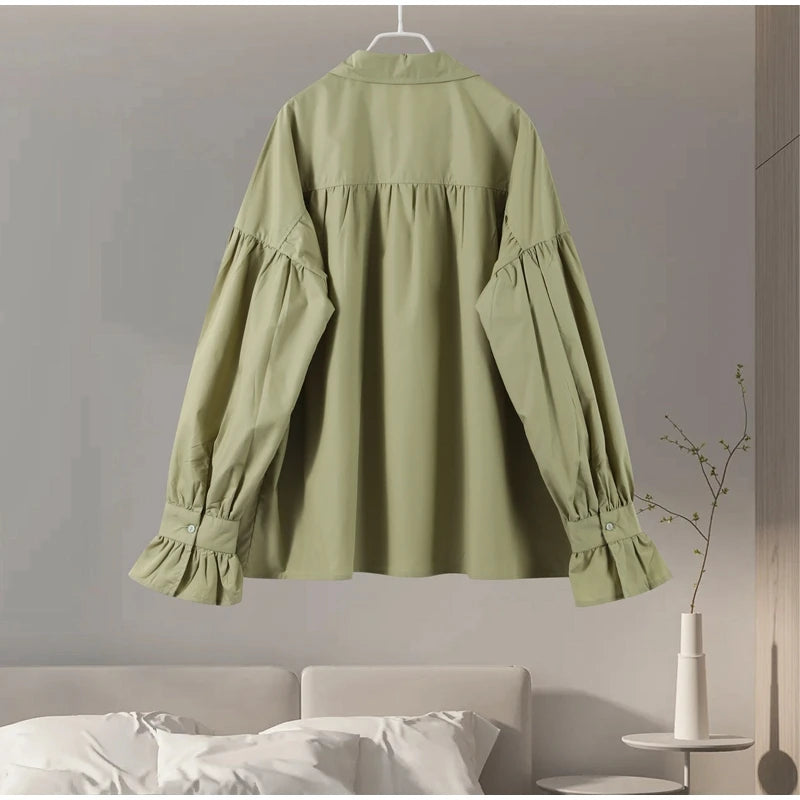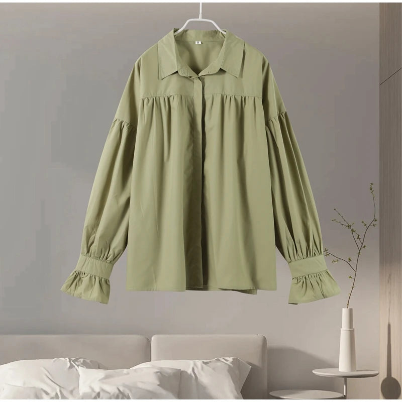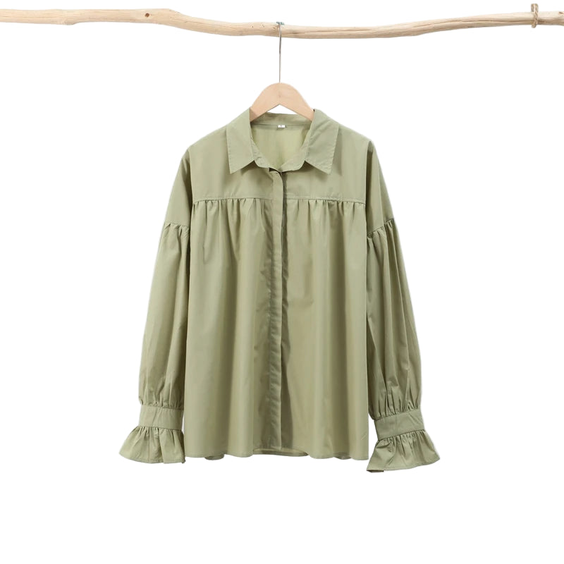 Plissert bluse i grønn med ballongermer – løs passform, knappelukking & klassisk krage (vår/sommer)