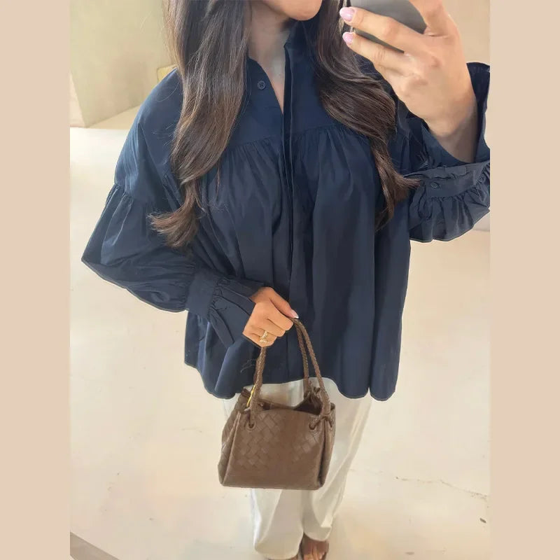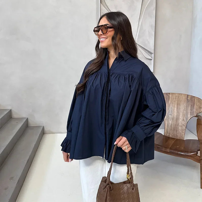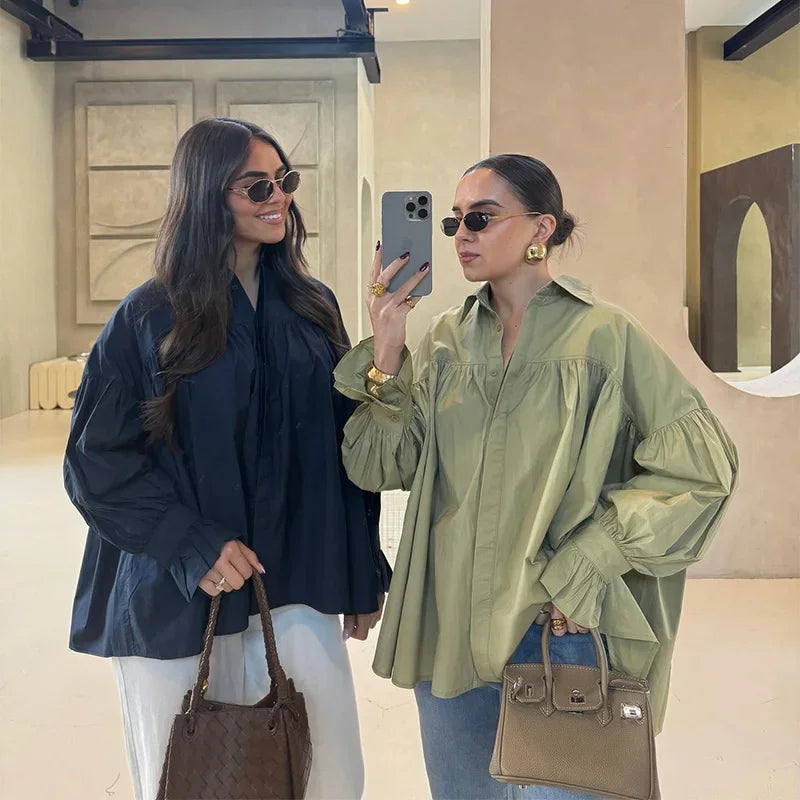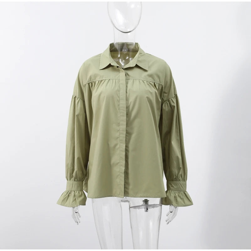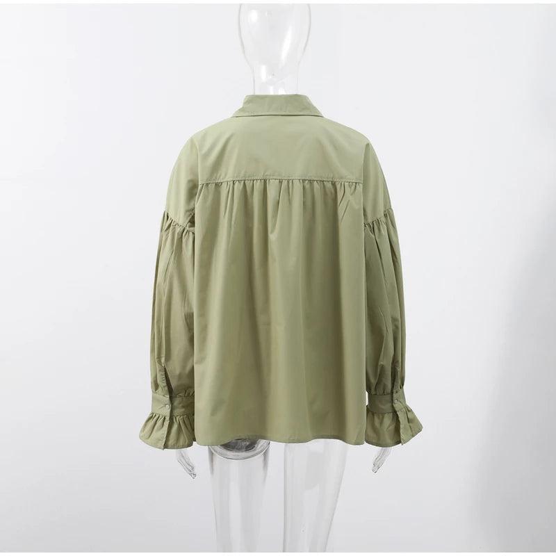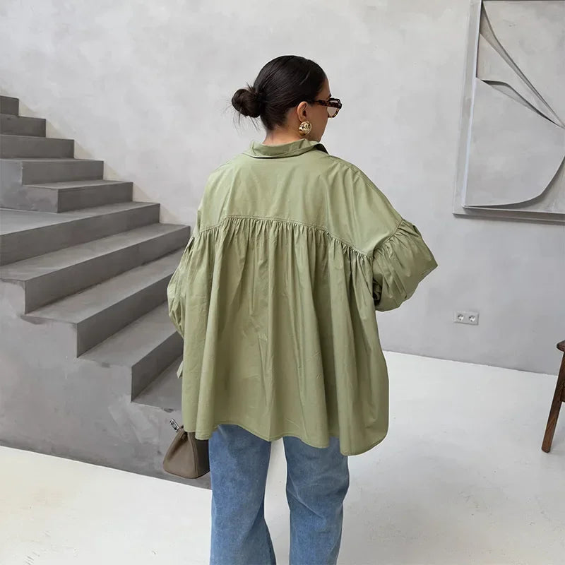 Plissert bluse i grønn med ballongermer – løs passform, knappelukking & klassisk krage (vår/sommer)
