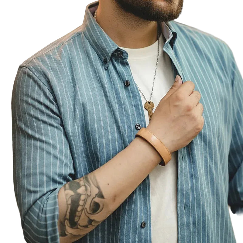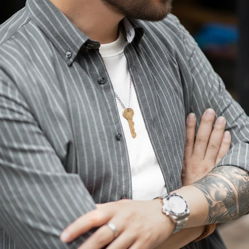 Retro Arbeidsskjorte for Menn – Børstet Blå Stripet Skjorte i Amerikansk Stil | Langermet Business Casual Skjorte til Høsten
