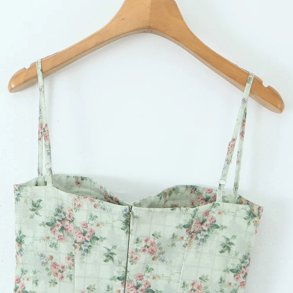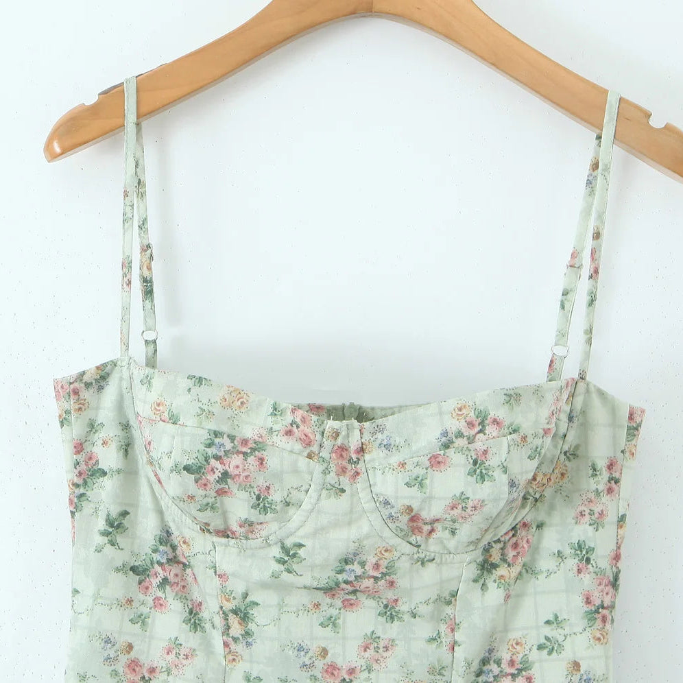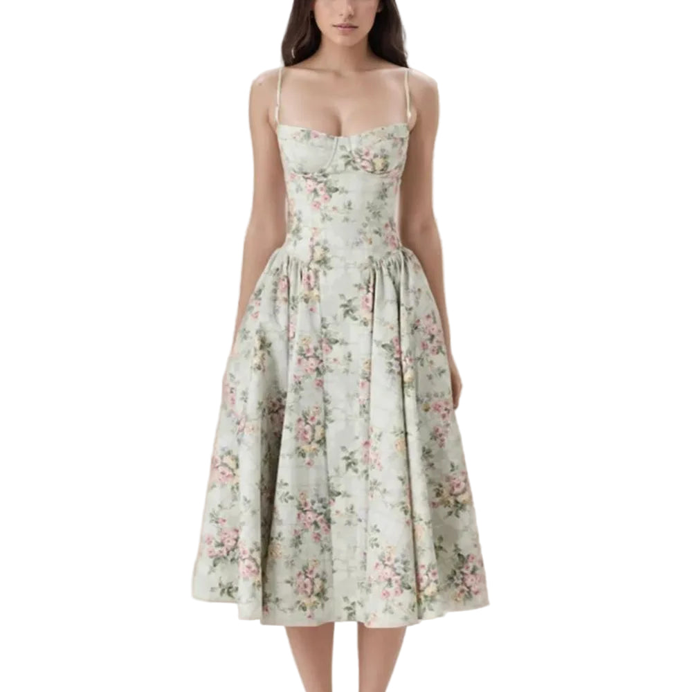 La romantikken blomstre med denne feminine og elegante kjolen i grønt med delikat blomsterprint. Kjolen har en korsett-inspirert overdel med spiler som gir støtte og fremhever figuren, kombinert med tynne stropper for et lett og sommerlig uttrykk. Den lave midjen med rynker og plisserte detaljer gir en flatterende passform, mens det svingende midi-skjørtet skaper en grasiøs silhuett.