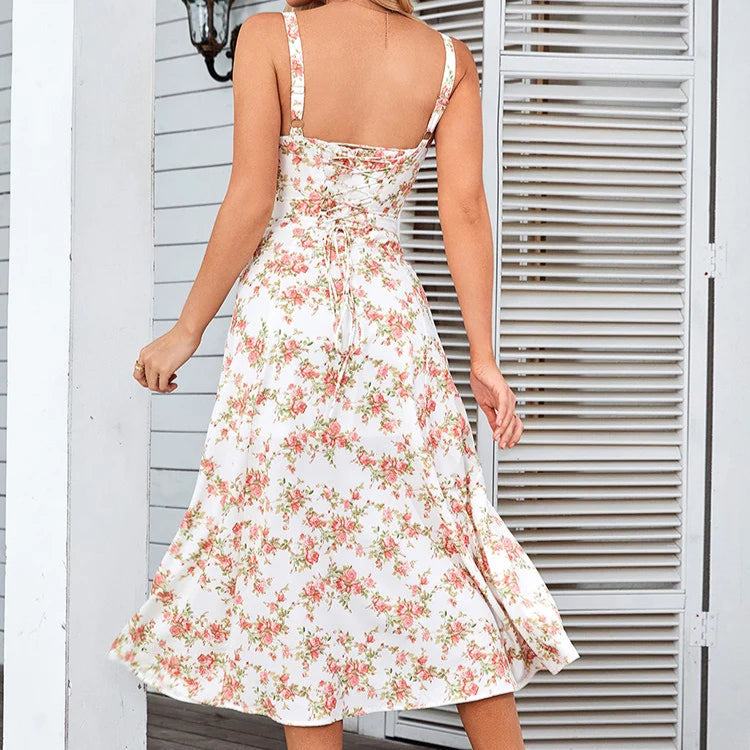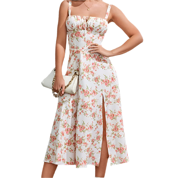 Framhev den feminine stilen din med denne nydelige sommerkjolen med blomsterprint – perfekt til både hverdags og sommerens festlige anledninger. Den elegante midi-lengden, kombinert med en flatterende splitt og delikate justerbare stropper, gjør dette til en kjole du kan bruke igjen og igjen.