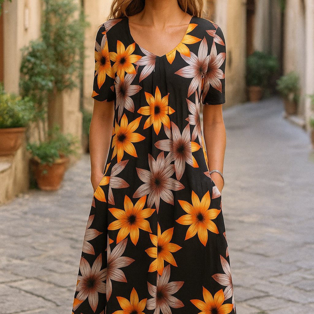 Denne avslappede og komfortable sommerkjolen er laget for deg som ønsker en lett og ledig stil i varmen. Med rund hals, korte ermer, og kne-langt snitt, er den perfekt for både hverdag, ferie og helgekos. Den er laget i myk, pustende bomull og har et dekorativt trykk som gir kjolen et friskt og feminint uttrykk.