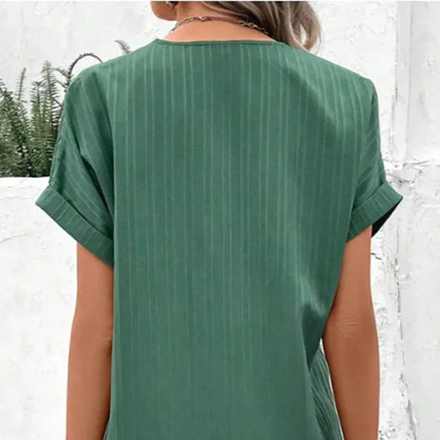 Denne enkle og elegante sommerkjolen er alt du trenger for en stilren og behagelig look – enten du er på jobb, ute med venner eller nyter en solrik dag i byen. Med flatterende V-hals, klassisk knappelukking og ensfarget design, passer den perfekt både som kontorkjole og til mer avslappede anledninger.