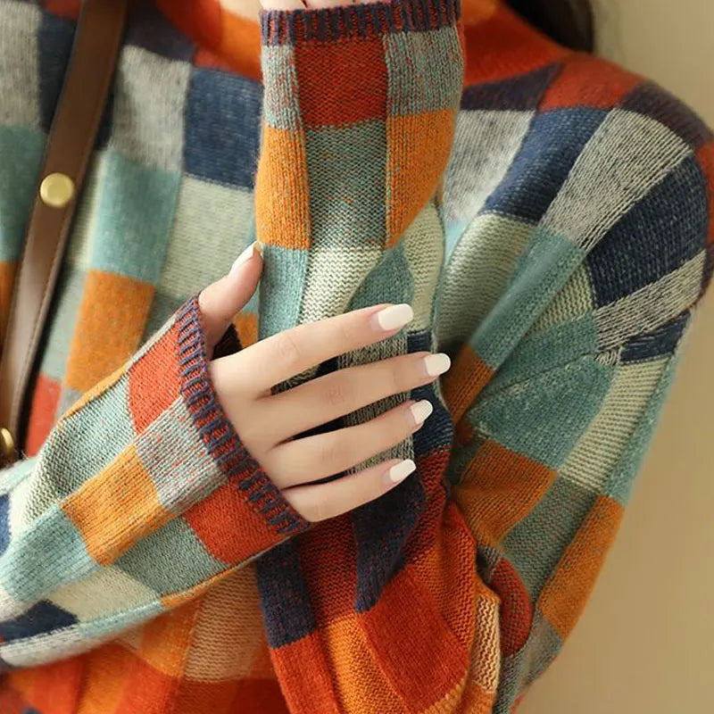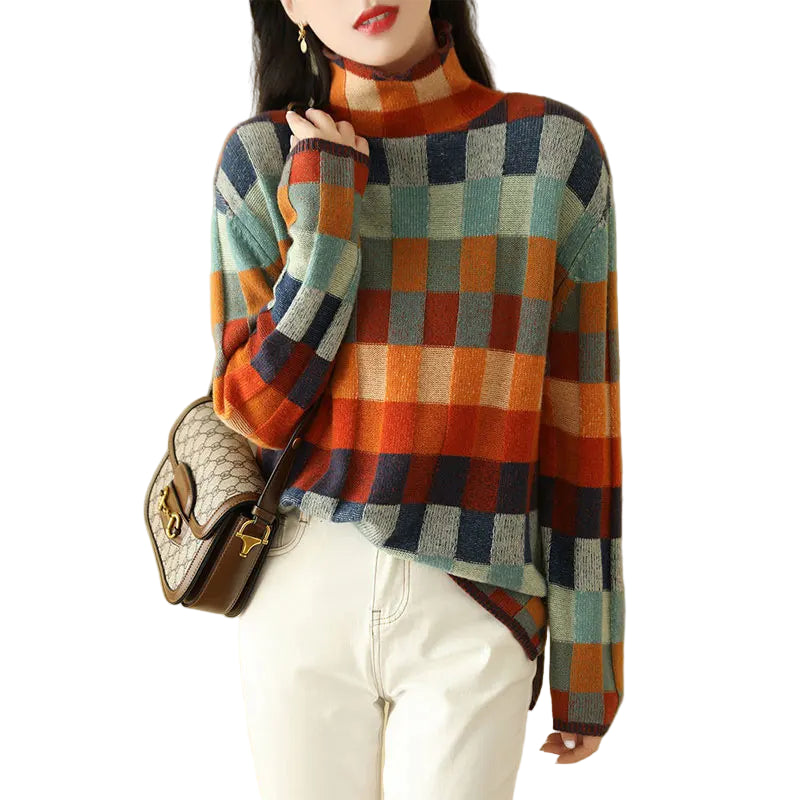 Streetwear Høyhalset Genser – Ruter & Kontrastfarger | Løs, Trendy & Varm Høst/Vinter
