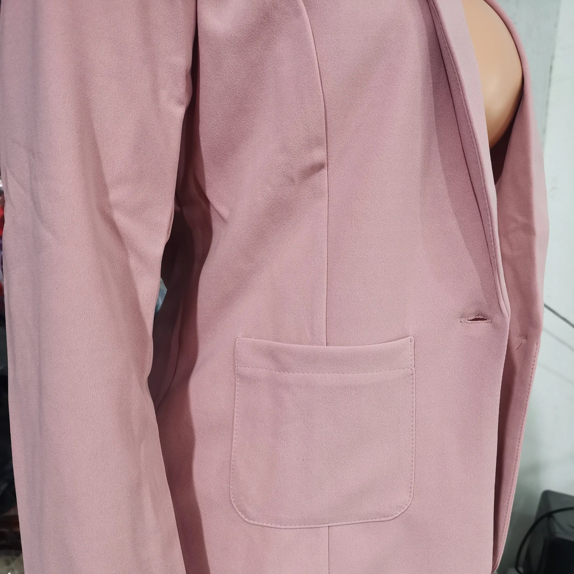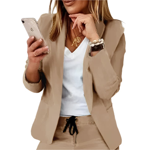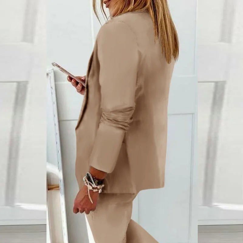 Oppdag det perfekte settet for en stilsikker og komfortabel overgangssesong. Dette to-delte settet består av en klassisk ensfarget blazer med krage og knapper, og en matchende bukse med elegant snitt – ideelt for deg som ønsker et enkelt, men moderne uttrykk til både jobb og fritid.